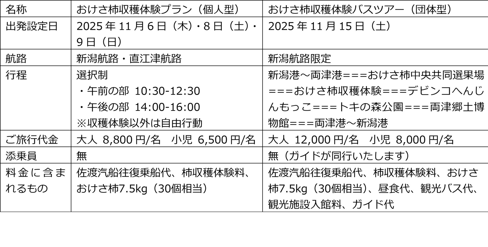 佐渡汽船株式会社(所在地:新潟県佐渡市、代表取締役: 尾渡英生、以下「佐渡汽船」)は、佐渡の特産品、「おけさ柿」の収穫体験ができるプランを販売開始しました。今年はおけさ柿の収穫体験と往復乗船代(カーフェリー2等)がセットになった個人型プランに加え、収穫体験後に人気観光地をめぐるバスツアーも発売。JA佐渡と連携した農・食体験コンテンツを通じて、佐渡島の魅力をぜひご体感ください。