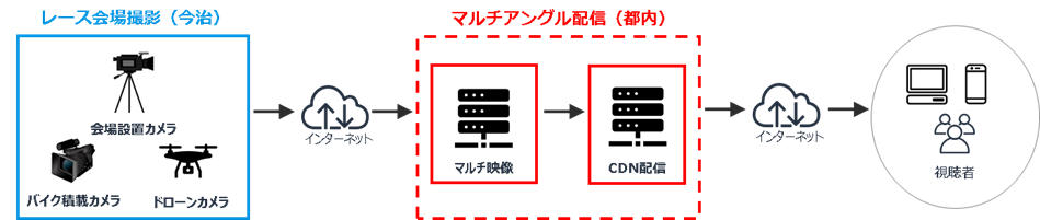今回の実証実験では、「J SPORTS」が撮影した中継映像と当社が開発したマルチアングルストリーミング配信システムを活用。コース上に設置した複数のカメラの映像をライブで同時配信することにより、視聴者はひとつの画面で4本の映像から好きなシーンを選んで楽しめるシステムとしました。