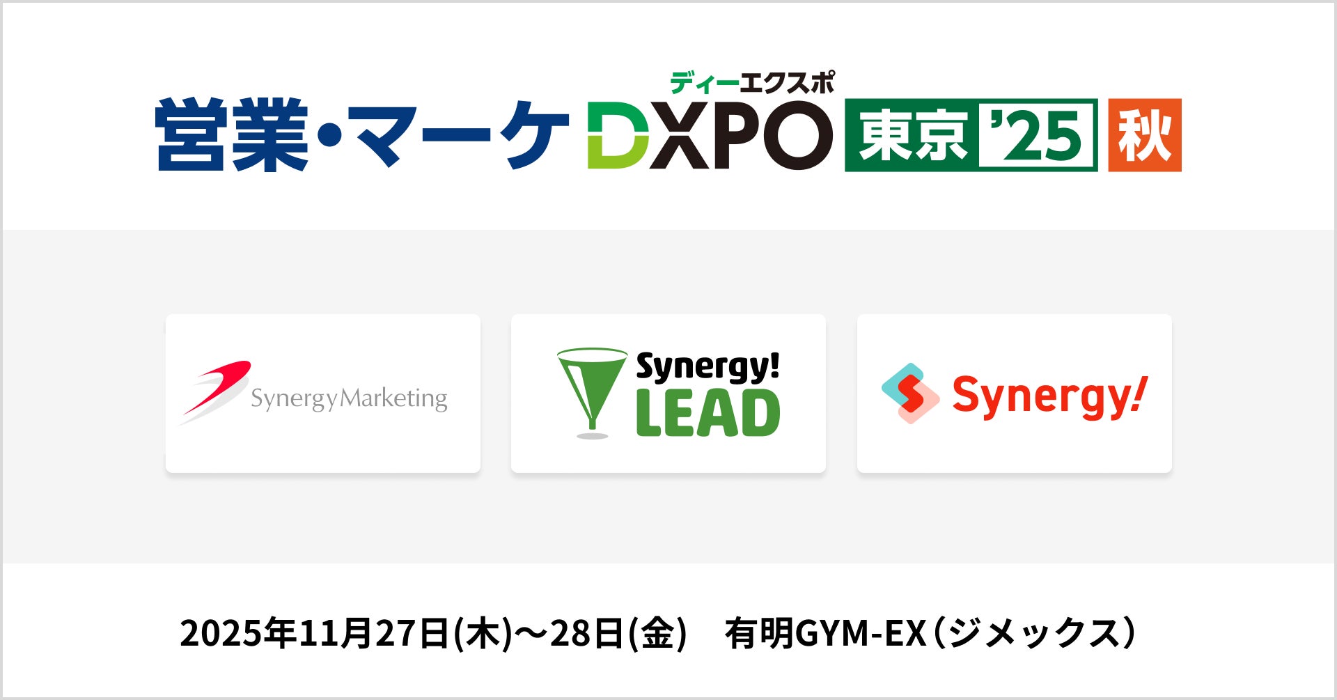 シナジーマーケティング株式会社(所在地:大阪市北区、代表:奥平 博史、以下:当社)は、2025年11月27日(木)〜28日(金)にわたり有明GYM-EXにて開催される「営業・マーケDXPO東京 25 秋」に出展いたします。