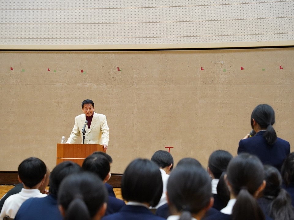 この度、警察庁特別防犯対策監の杉良太郎氏が、港区立高松中学校で1年生の生徒に向けて、特殊詐欺防止に向けた広報啓発を実施しました。