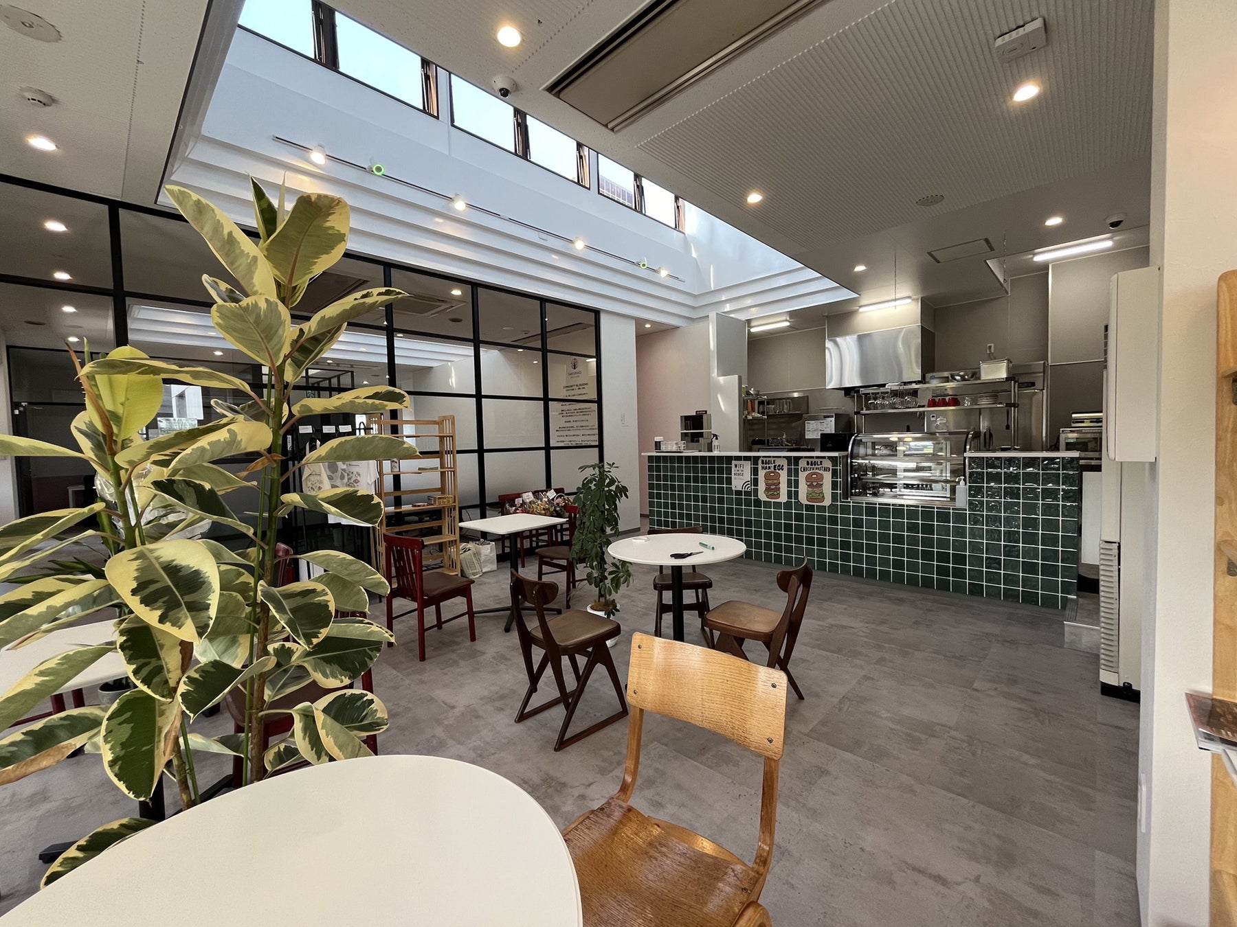 大きな窓から自然光が差し込む明るい店内には、ゆったりと寛げるソファ席やおしゃれな丸テーブル席を配置。親子で座れるボックスシートもあり、利用者同士がお茶を飲みながら交流できる温かなコミュニティ空間です。
