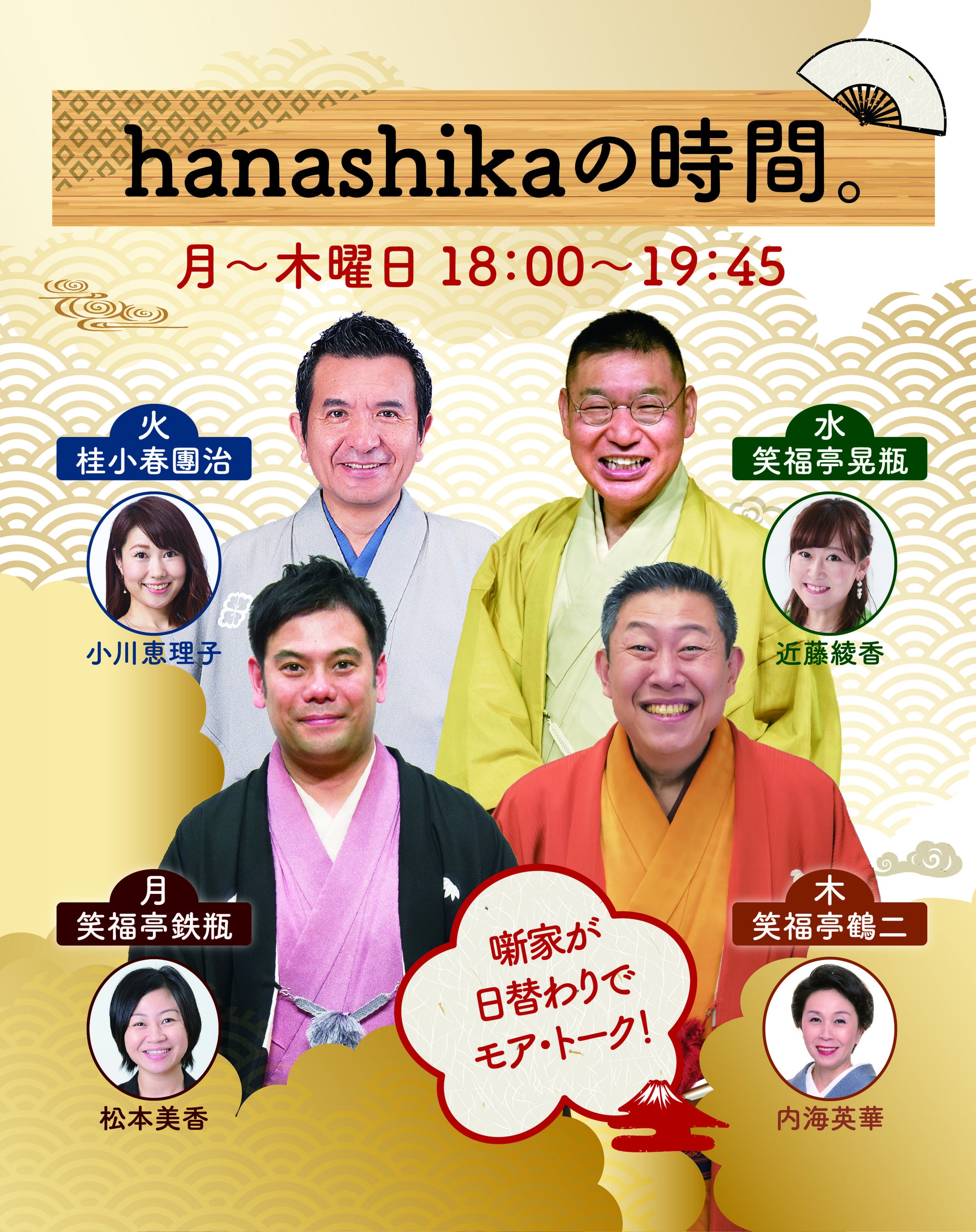 「hanashikaの時間。」出演者の噺家による落語はもちろん、番組アシスタントも登場しての曜日対抗クイズバトルも開催いたします。