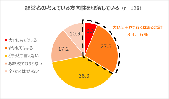 全国の会社員に「経営者の考えている方向性を理解しているか」を聞いた調査によると、大いに+ややあてはまると回答した人の割合は、約33%にとどまります。