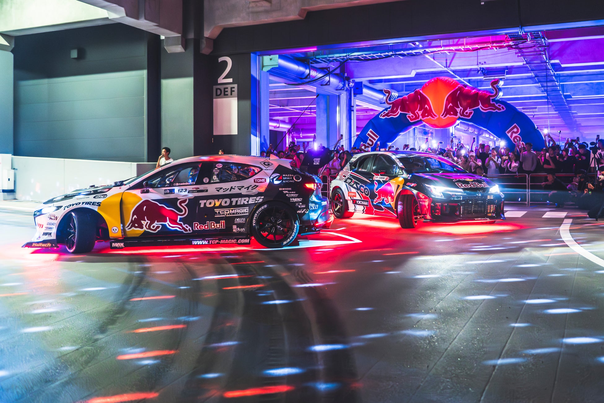 国内トップクラスのマシンが並ぶ中、倉庫内の螺旋ランプウェイをドリフトレジェンドのマッド・マイク・ウィデット操るMAZDA 3と箕輪大也のToyota GR Corollaのマシン2台がドリフトしながら駆け上がる圧巻のパフォーマンスを披露。この夜、特別に招待されたゲストたちは会場でその熱気を体感し、参加者のSNS投稿を通じてイベントの存在を知った多くの人々から、次回開催を望む声が寄せられました。
