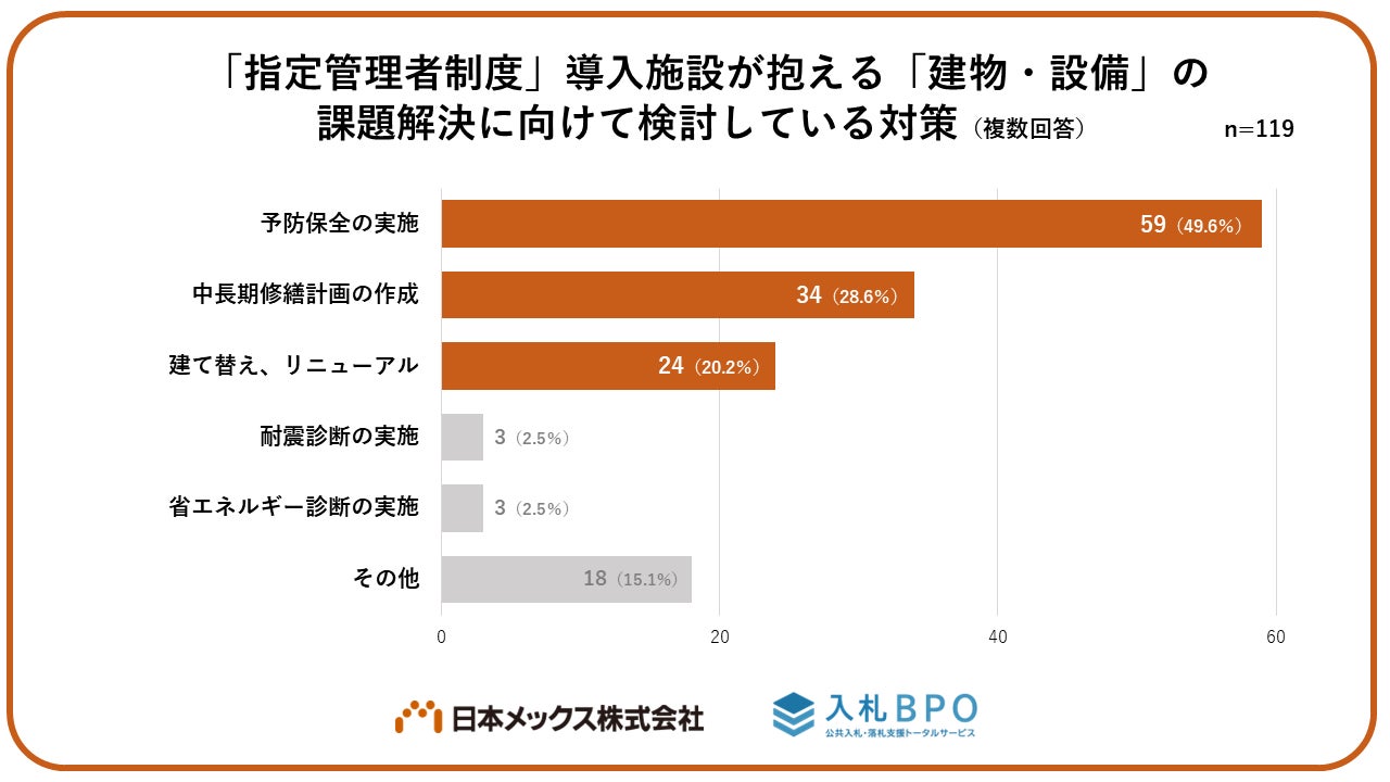 「建物・設備」の課題の対策として約半数(49.6%)の自治体が「予防保全の実施」を検討している<結果2>