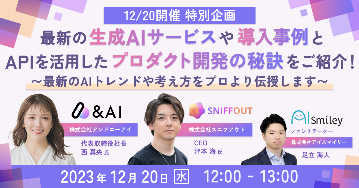 【12/20開催特別企画】最新の生成AIサービスや導入事例とAPIを活用したプロダクト開発の秘訣をご紹介!~最新のAIトレンドや考え方をプロより伝授します~
