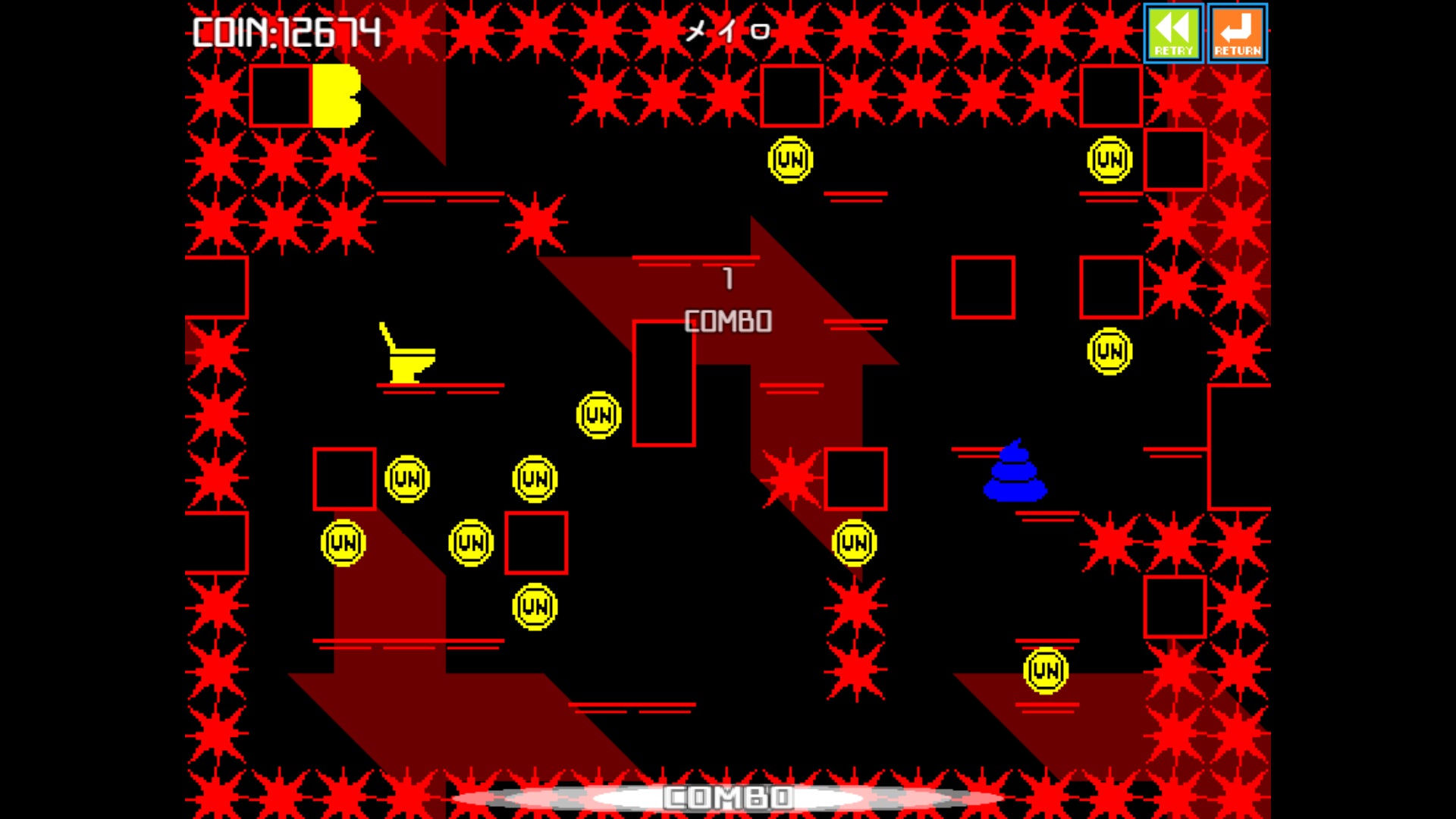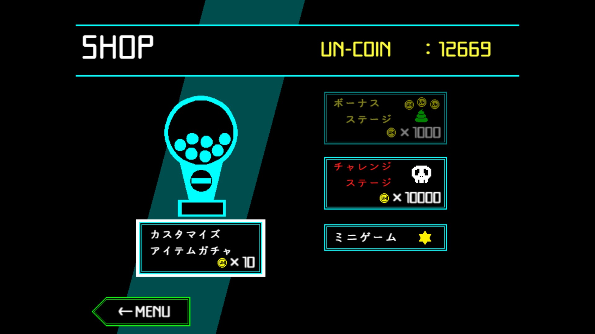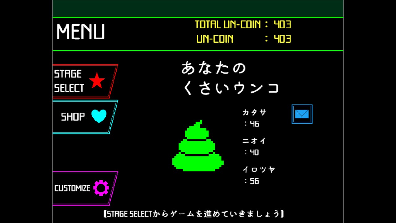 ステージで入手できる「UN-COIN」を消費して、ウンコの見た目をカスタマイズできるガチャを回したり、さらなる高難度ステージを解放したりすることができます。
