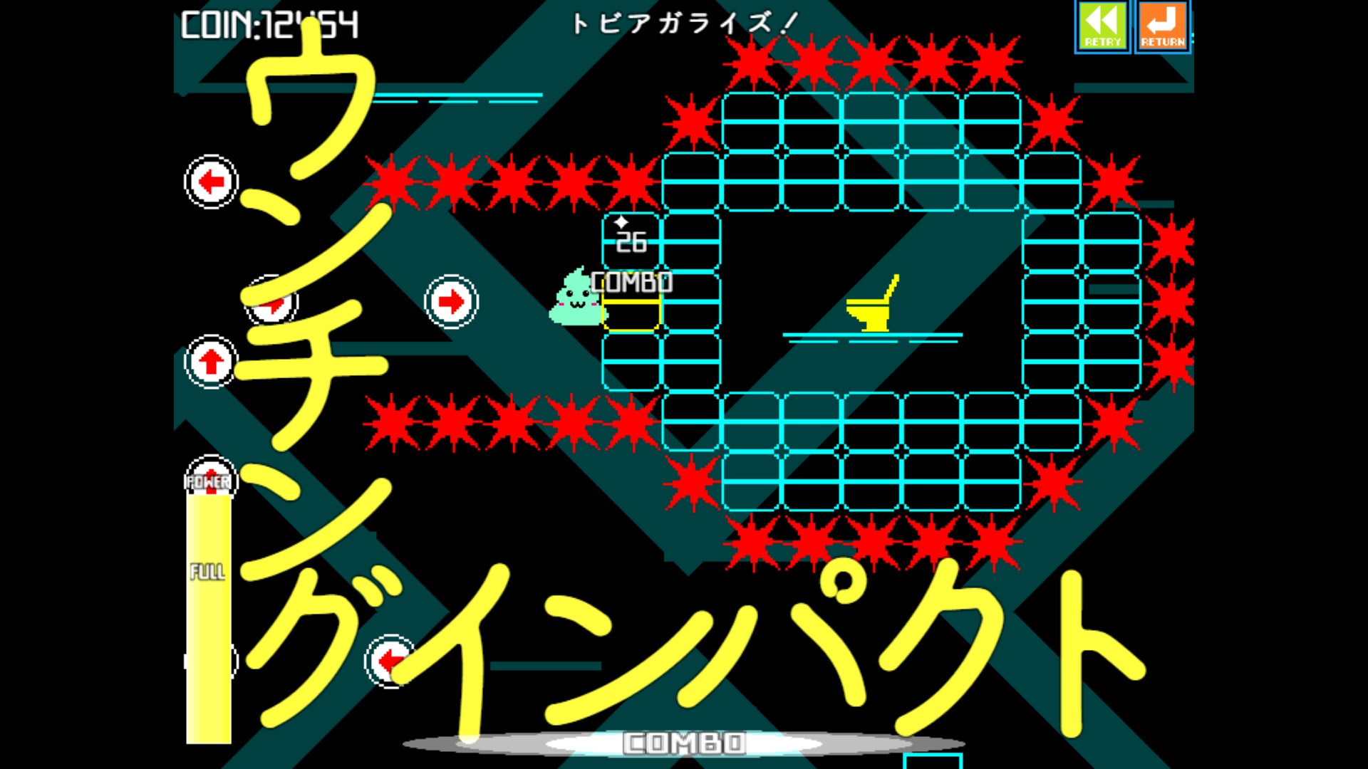 レトロネオン調のグラフィック&クールなサウンドを堪能しながら 自動走行するウンコをジャンプさせてゴールの便器に導くスタイリッシュウンコアクション。
