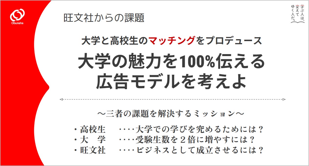 受験生の減少や他大学との差別化といった大学側の課題、大学入試方式の複雑化や環境による格差問題といった高校生を取り巻く課題を念頭に、旺文社の受験情報誌やWebサービスなどの媒体を使った大学の魅力を訴求する広告プランを、高校生自身に問いかけます。