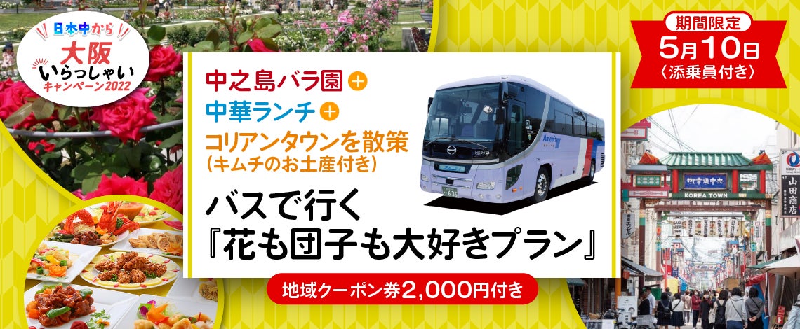 株式会社フォーティーズ(本社:大阪市鶴見区、代表取締役 岡武史)は【5月10日(水)限定大阪出発】《全国旅行支援》〈添乗員付き〉中之島バラ園+大阪で有名店で中華ランチ+コリアンタウンを散策(キムチのお土産付き) バスで行く『花も団子も大好きプラン』日帰りバスツアーのオンライン販売を開始しました。