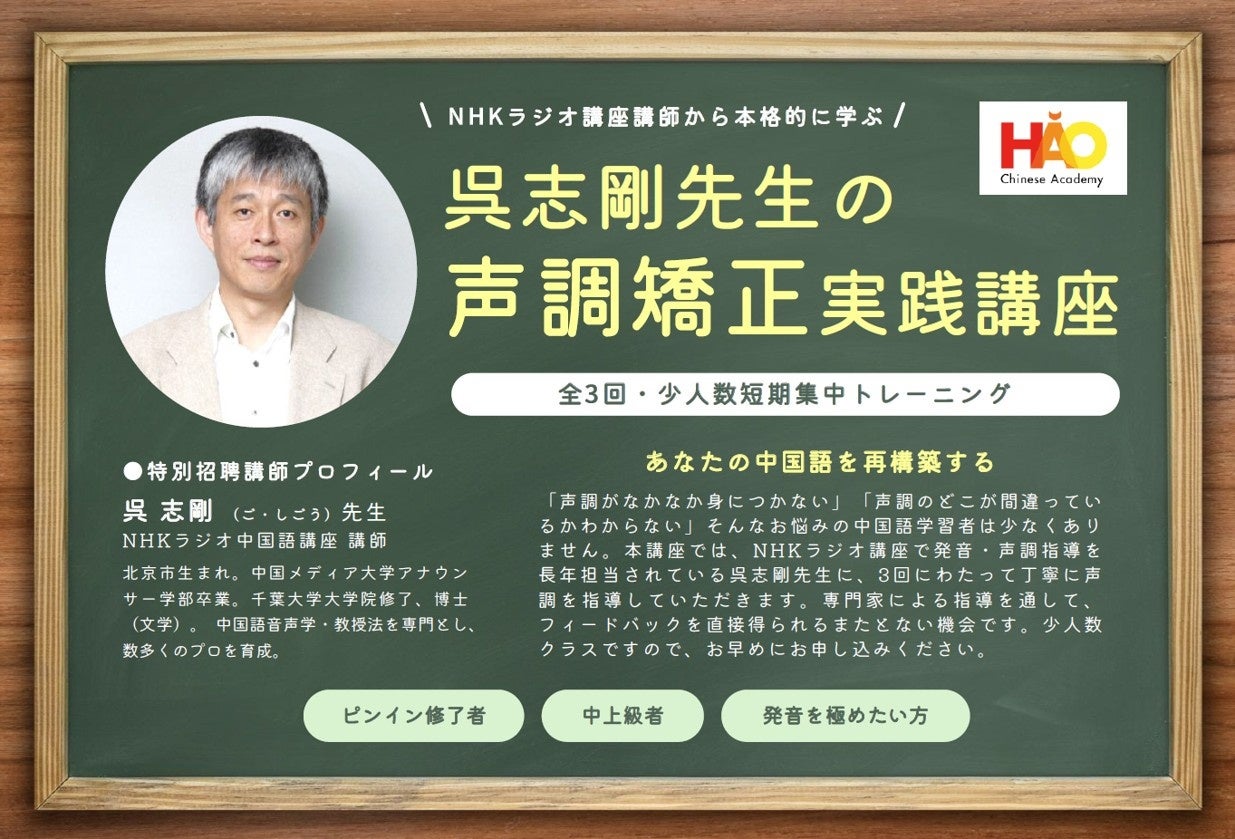 株式会社イーオン(本社:東京都新宿区、代表取締役社長:重野卓)が運営するハオ中国語アカデミーは、NHKラジオ中国語講座の講師として長年、日本人の発音指導に深く携わってこられた呉志剛先生を再び講師にお迎えし、2026年5月16日(土)より全3回の「声調矯正実践講座」を開催いたします。