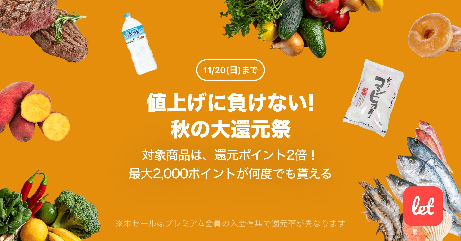 株式会社レット(本社:東京都港区、代表:佐藤 航陽)が運営する、食品ロス/在庫ロス削減のマーケット「Let(レット)」内で「値上げに負けない!秋の大還元祭」を11月18日(金) 18:00より開催します。期間中、プレミアム会員様限定で対象の食品をご購入いただくと、2,000ポイントを上限に還元ポイントが2倍になります。期間中のご購入であれば、ポイント還元はお一人様あたり何度でもご利用いただけます。