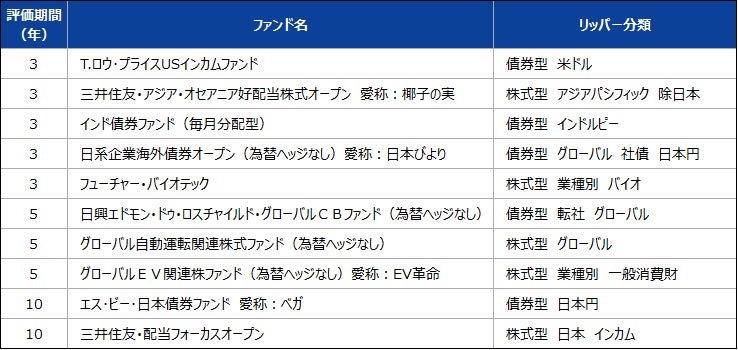 LSEG リッパー・ファンド・アワードは毎年、多くのファンドのリスク調整後リターンを比較し、評価期間中のパフォーマンスが一貫して優れているファンドと運用会社を表彰いたします。 選定に際しては、「Lipper Leader Rating (リッパー・リーダー・レーティング)システム」の中の「コンシスタント・リターン(収益一貫性)」を用い、評価期間3年、5年、10年でリスク調整後のパフォーマンスを測定いたします。評価対象となる分類ごとに、コンシスタント・リターンが最も高いファンドにLSEG リッパー・ファンド・アワードが贈られます。詳しい情報は、lipperfundawards.comをご覧ください。LSEG Lipperは、本資料に含まれるデータの正確性・信頼性を確保するよう合理的な努力をしていますが、それらの正確性については保証しません。 |