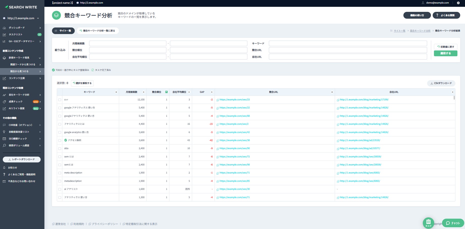 ・「競合キーワード分析」機能などを活用し、競合他社が対応済かつ、自社で未対応の対策すべきキーワードを抽出。新規記事やリライト執筆を積極的に実施