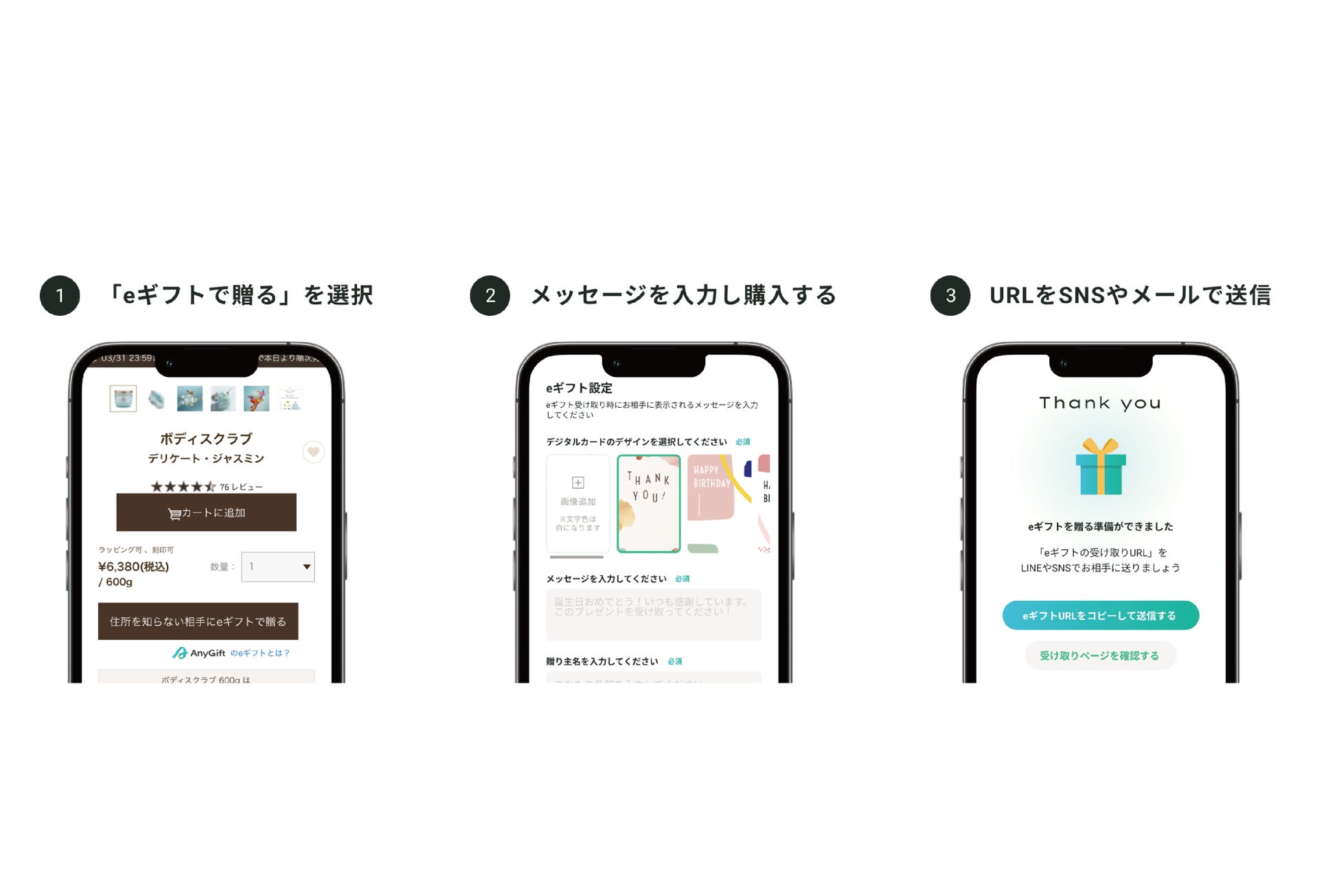 「AnyGift(エニーギフト)」は、相手の住所を知らなくてもLINEやメールでギフトを贈れる"eギフト機能"を、自社ECサイトに組み込み・導入ができるサービスです。