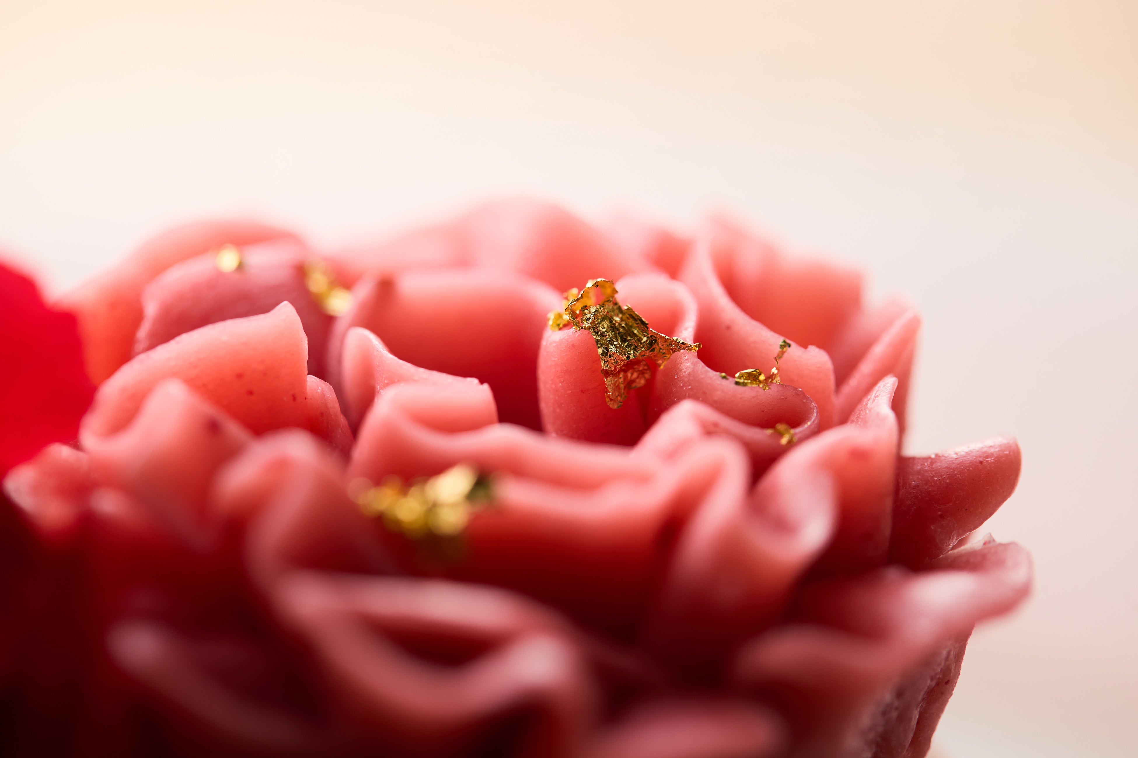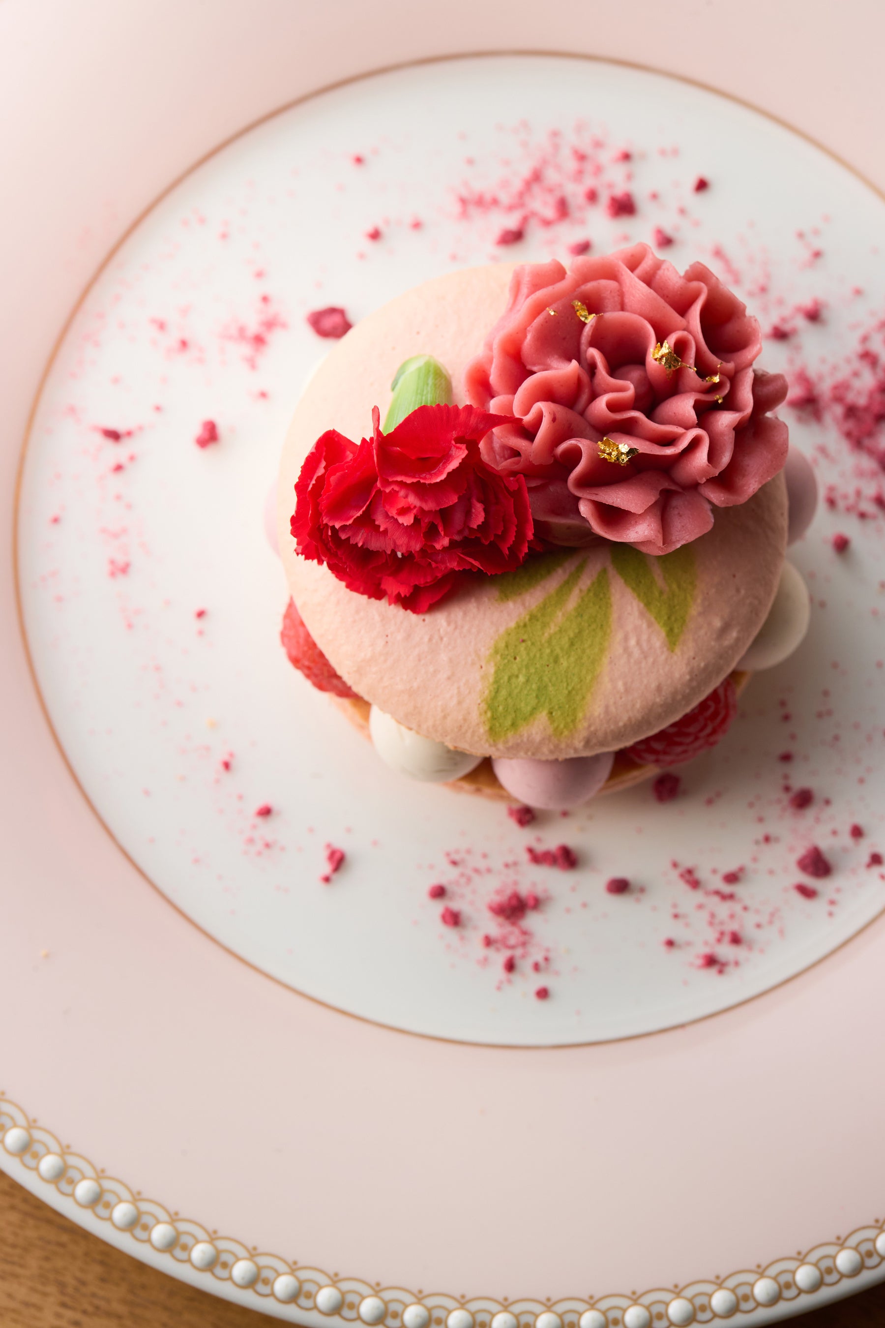マカロンケーキに飾られたのは、カーネーションに見立てた繊細で美しい花びらのフォルムが目を惹くラズベリーとあまおうペーストを練りこんだバタークリームと、カーネーションのエディブルフラワー。