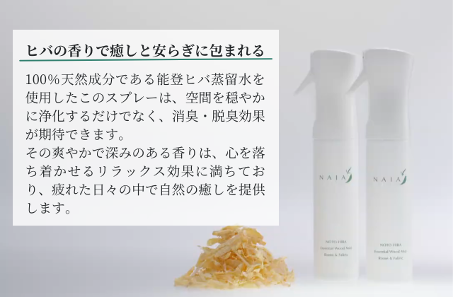 能登ヒバ(アテ)は石川県の県木で、抗菌性が高く評価され、社殿、仏閣、城閣など古くから日本の伝統的な建造物に使われてきました。このスプレーは、その歴史ある木の力を活用し、現代の生活空間に古の知恵をもたらすアイテムとして創り上げられました。