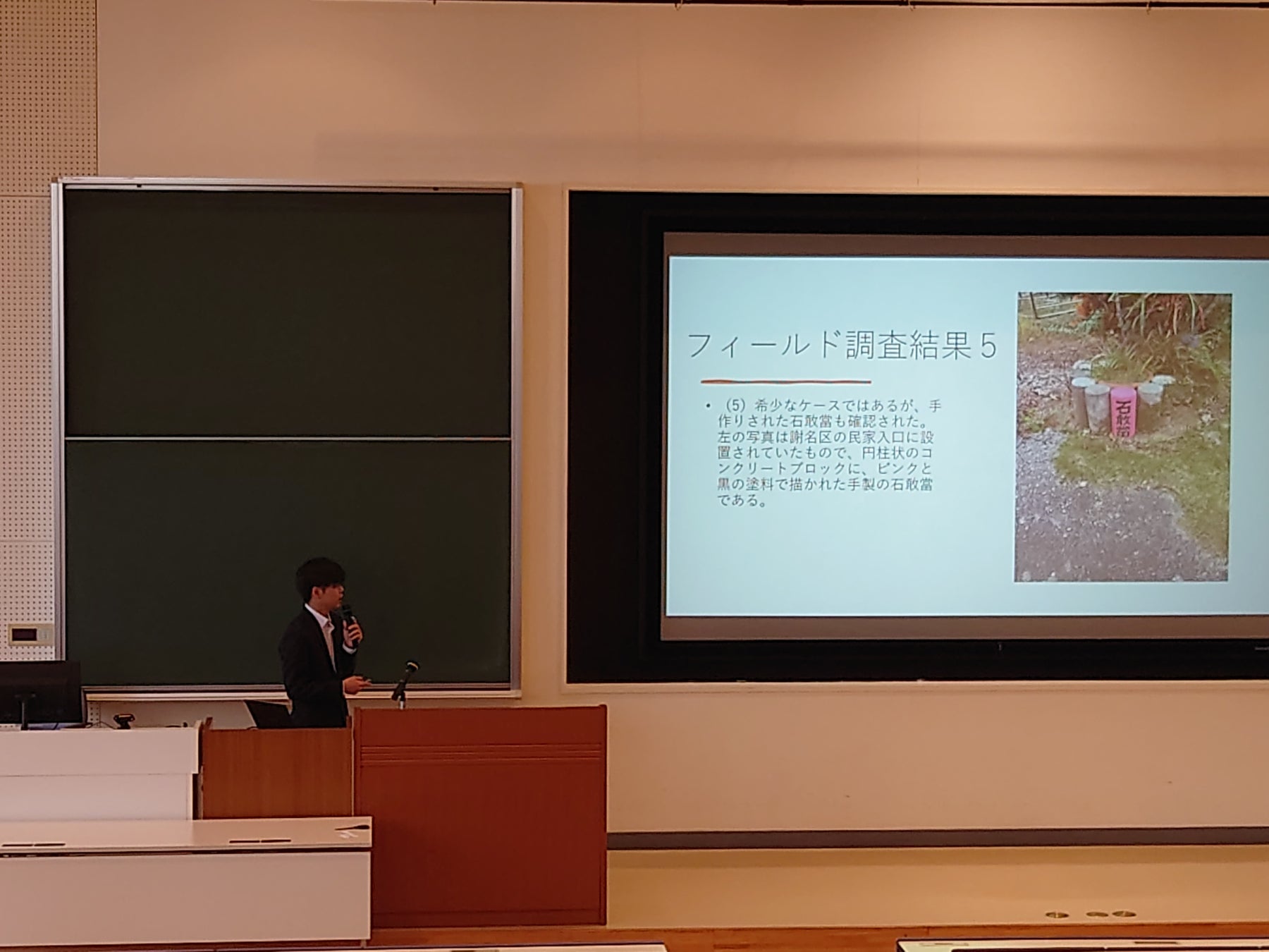 沖縄の石敢當の分布を地道なフィールドワークで明らかにした島袋龍生さんは、「張軼欧先生が貴重な時間を割いて、夜遅くまで指導してくださった。一人では解決できなかった論理の矛盾をご指摘してもらったおかげで、なんとか最後まで書き上げることができました」と感謝を述べました。