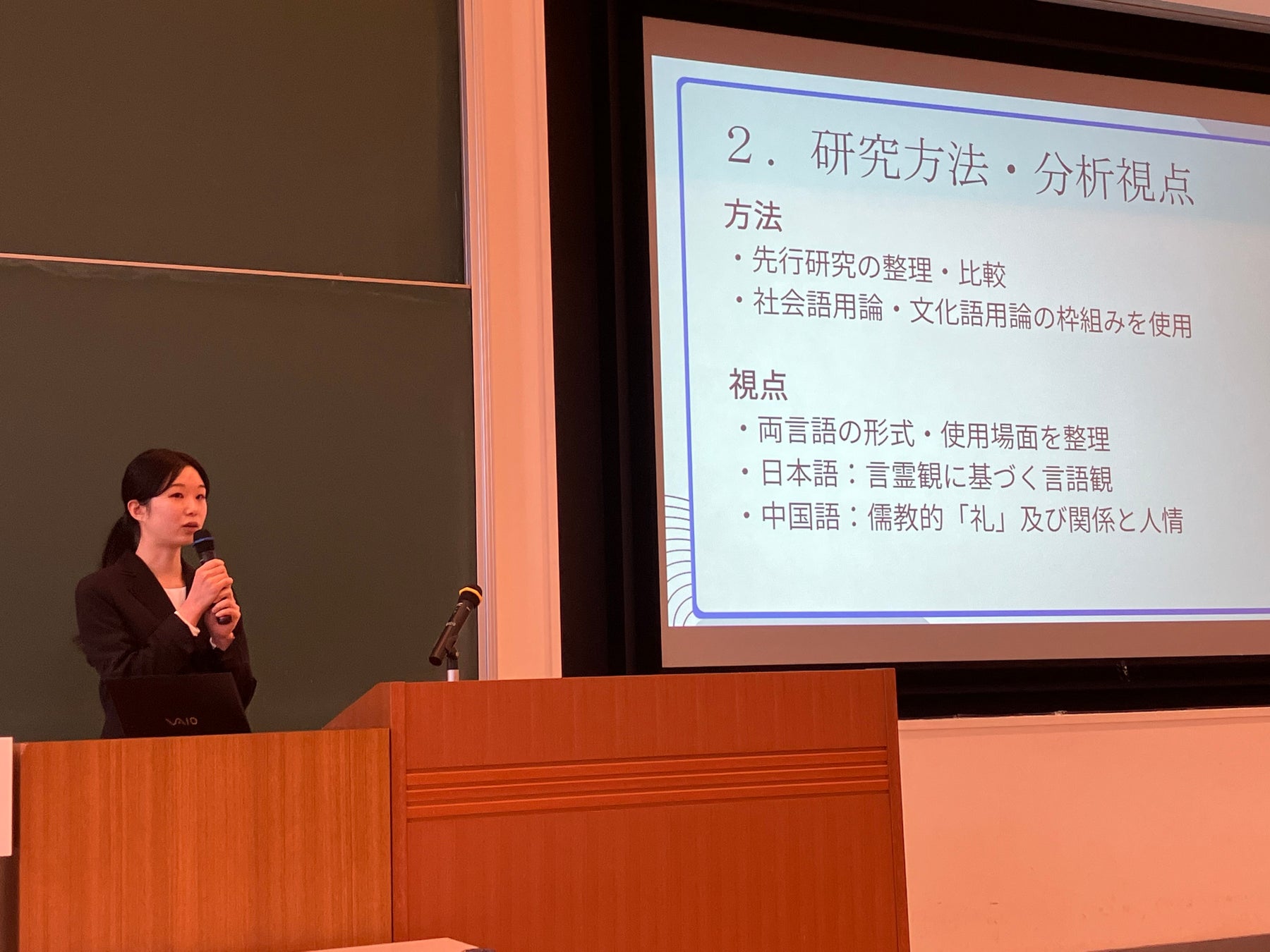 発表を聞いた国際コミュニケーションコース3年生の土肥鈴音さんは、「膨大なデータを集めて分析したり、時間のかかるフィールドワークをされて、卒業研究が一朝一夕ではできないことがわかりました」と圧倒されていました。