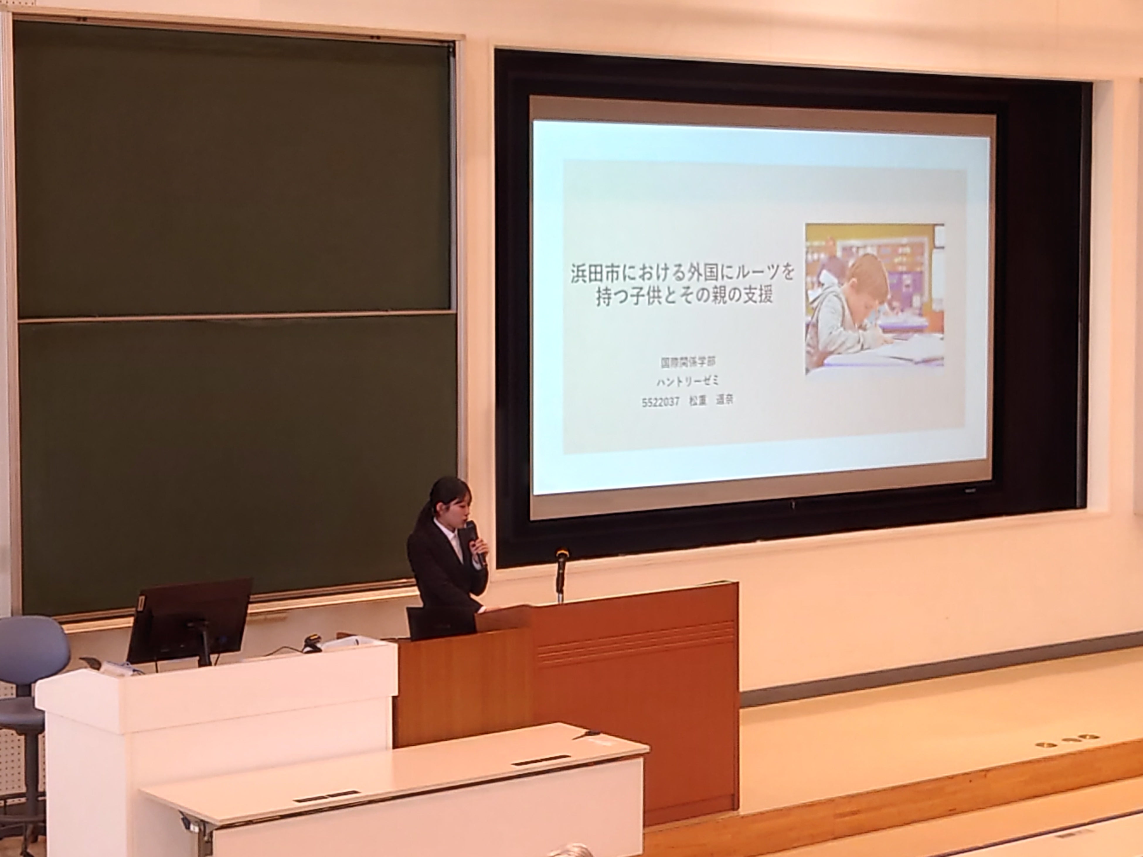 CLD児、つまり「多文化多言語の子ども」の支援について研究した松重遥奈さんは、「第二言語習得論の授業で、外国にルーツに持つ子どもたちがこれからの日本社会の重要な構成員になることに気付かされました。彼らの力を最大限に引き出せる社会づくりを実現したいと思い、このテーマを選びました」と卒業研究のテーマを思いついた瞬間を共有しました。