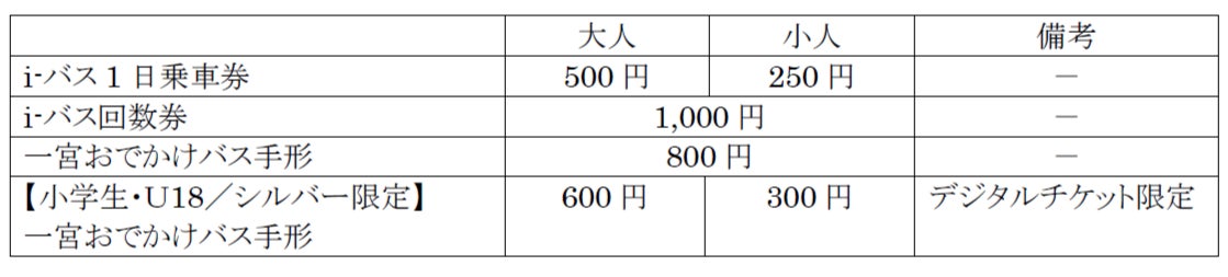一宮地区を運行する「i-バス」の1日乗車券、回数券のほか、名鉄バスを含めた市内全バス路線で利用可能な1日乗車券「一宮おでかけバス手形」をデジタルチケットとして販売します。また、24時間いつでもどこでも購入できます。
