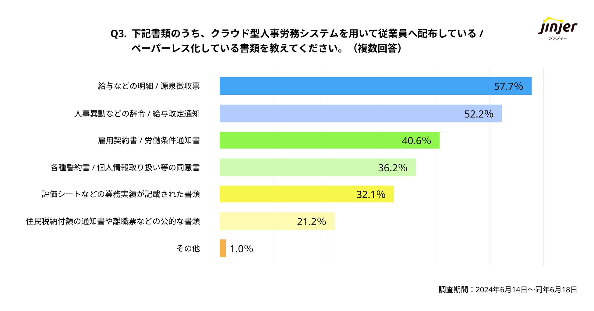 「クラウド型人事労務システムにより、ペーパーレス化している書類」について質問したところ、上から「給与などの明細 / 源泉徴収票(57.7%)」「人事異動などの辞令 / 給与改定通知(52.2%)」「雇用契約書 / 労働条件通知書(40.6%)」という結果になりました。