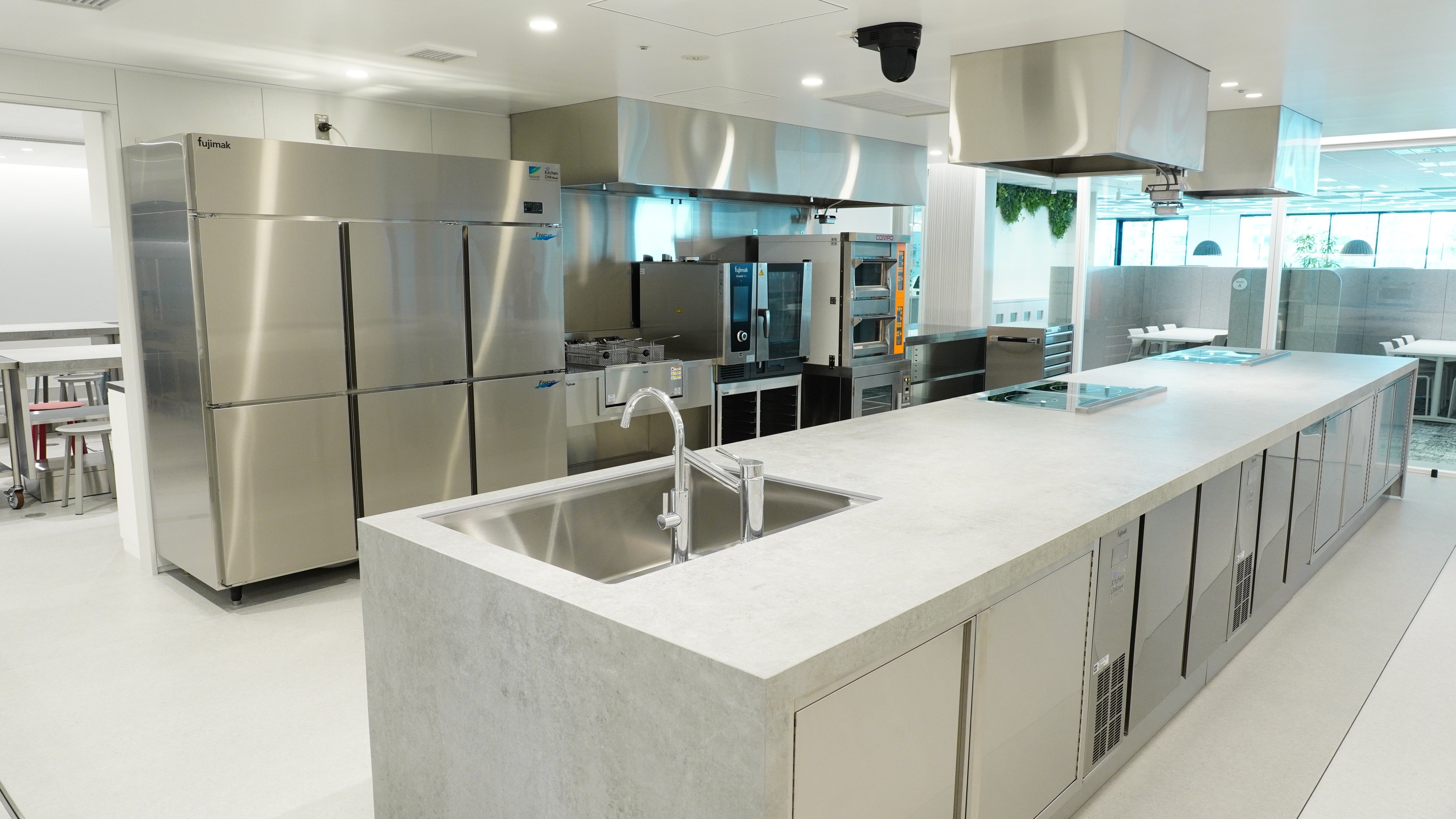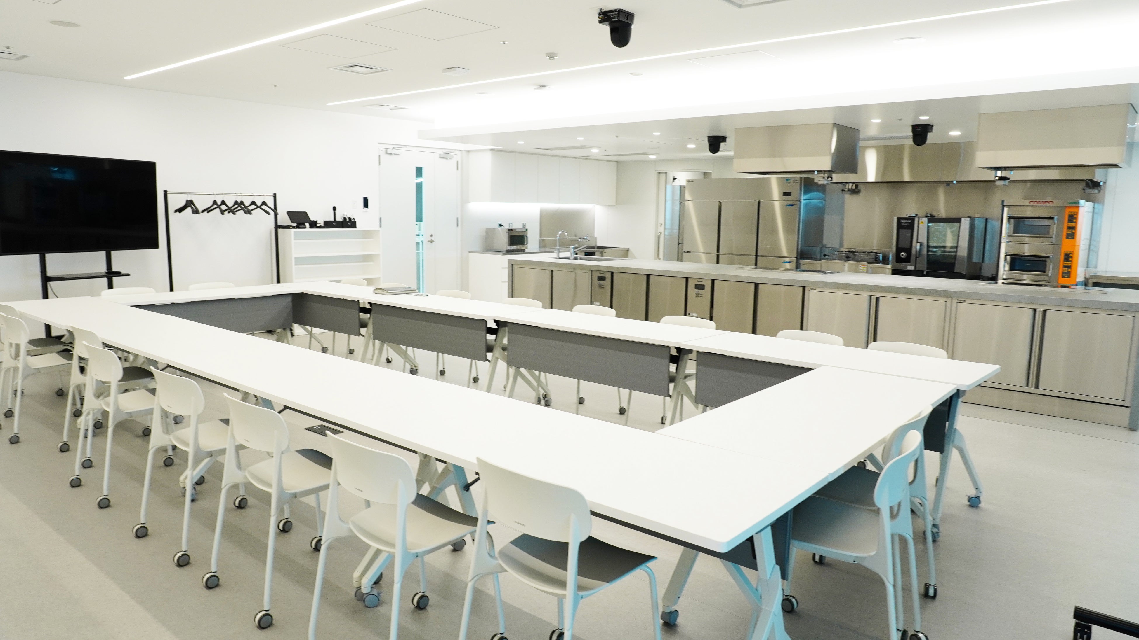 業務用のお客様への提案や料理教室、講習会など多目的に活用できるキッチンスペースを設置。実践的な調理環境を再現できる設備を揃え、よりお客さまの目線に立ち、ニーズに応える提案を行います。