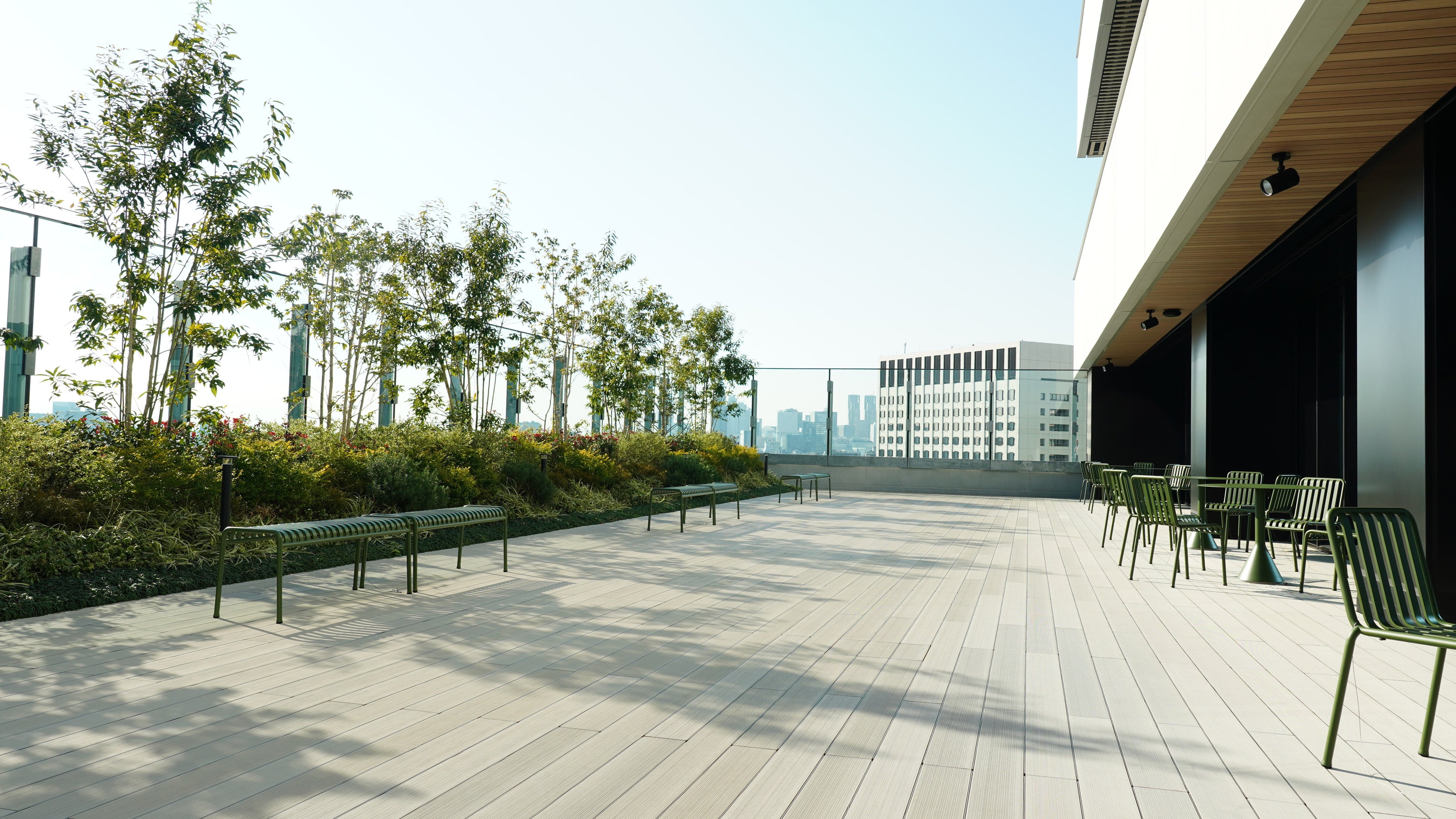 ビルテナントの共有テラスの他に、12階には当社関係者のみ使用できる専用テラスがあります。最上階で見晴らしがよく、緑も豊かなテラスで気軽にリフレッシュすることができます。
