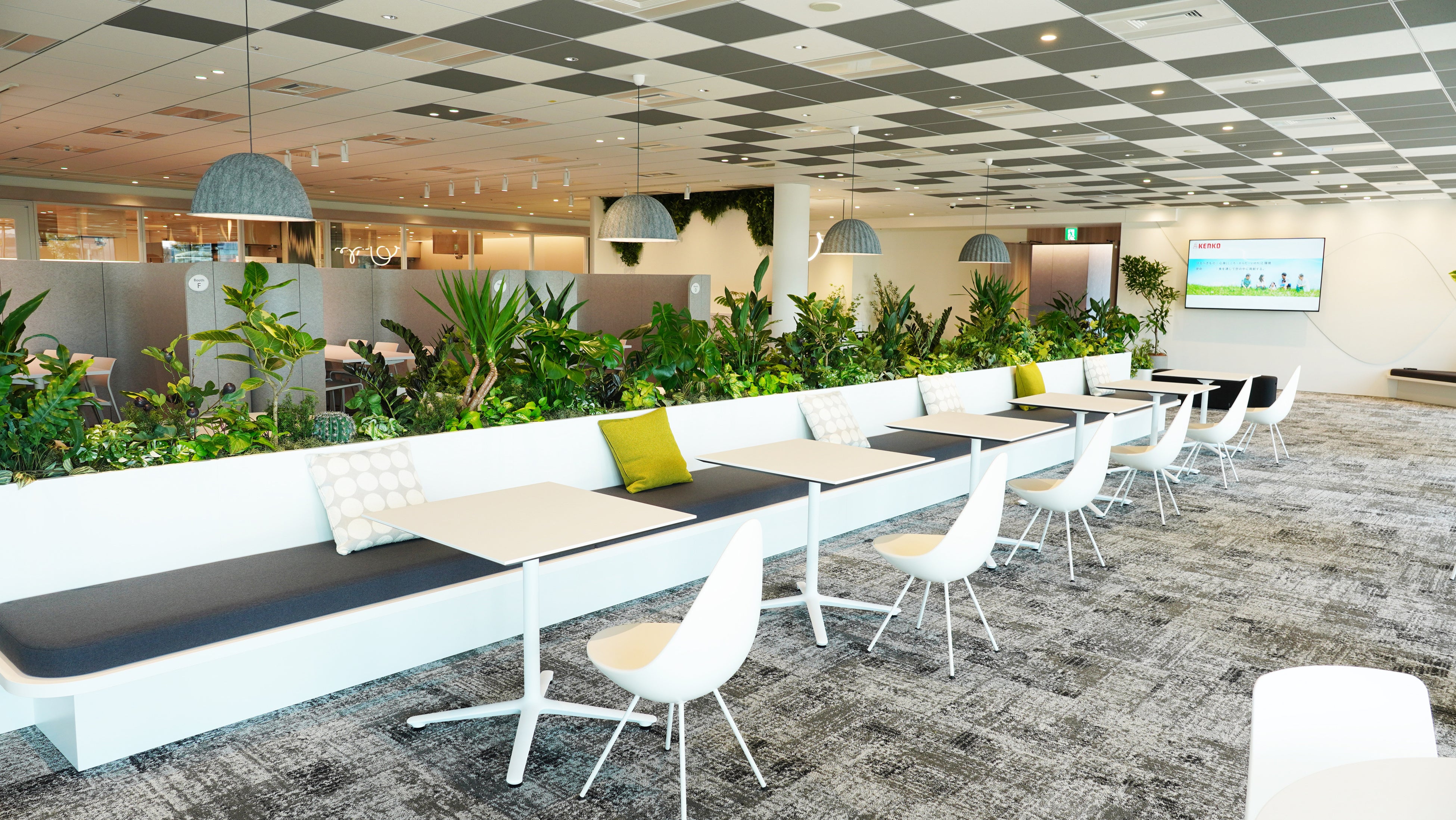 従業員同士のコミュニケーションや、休憩・リラックスに利用可能なカフェスペースを配置。このスペースから様々なアイデアや企業文化を醸成していきたいという想いを込めた、カフェの名称“K.Brew Cafe”も社内公募で決定しました。部署を超えた社内のつながりを深める場として機能します。