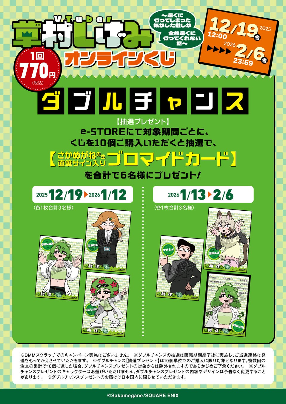 e-STOREにて対象期間ごとに、くじを10個ご購入いただくと抽選でさかめがね先生【直筆サイン入りカード】をプレゼント!