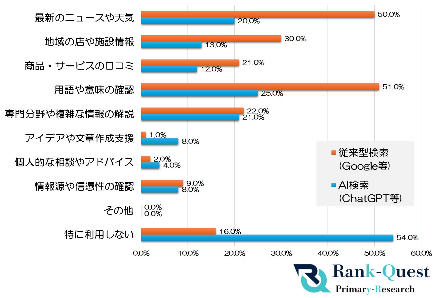 特にニュースや用語検索は、情報源の幅広さと即時性において従来の検索エンジンが持つ強みが生かされている場面といえるでしょう。日々の生活に直結する「今すぐ知りたい情報」を探す際には、やはり安心して使える手段として従来型が優位に立っていることがうかがえます。