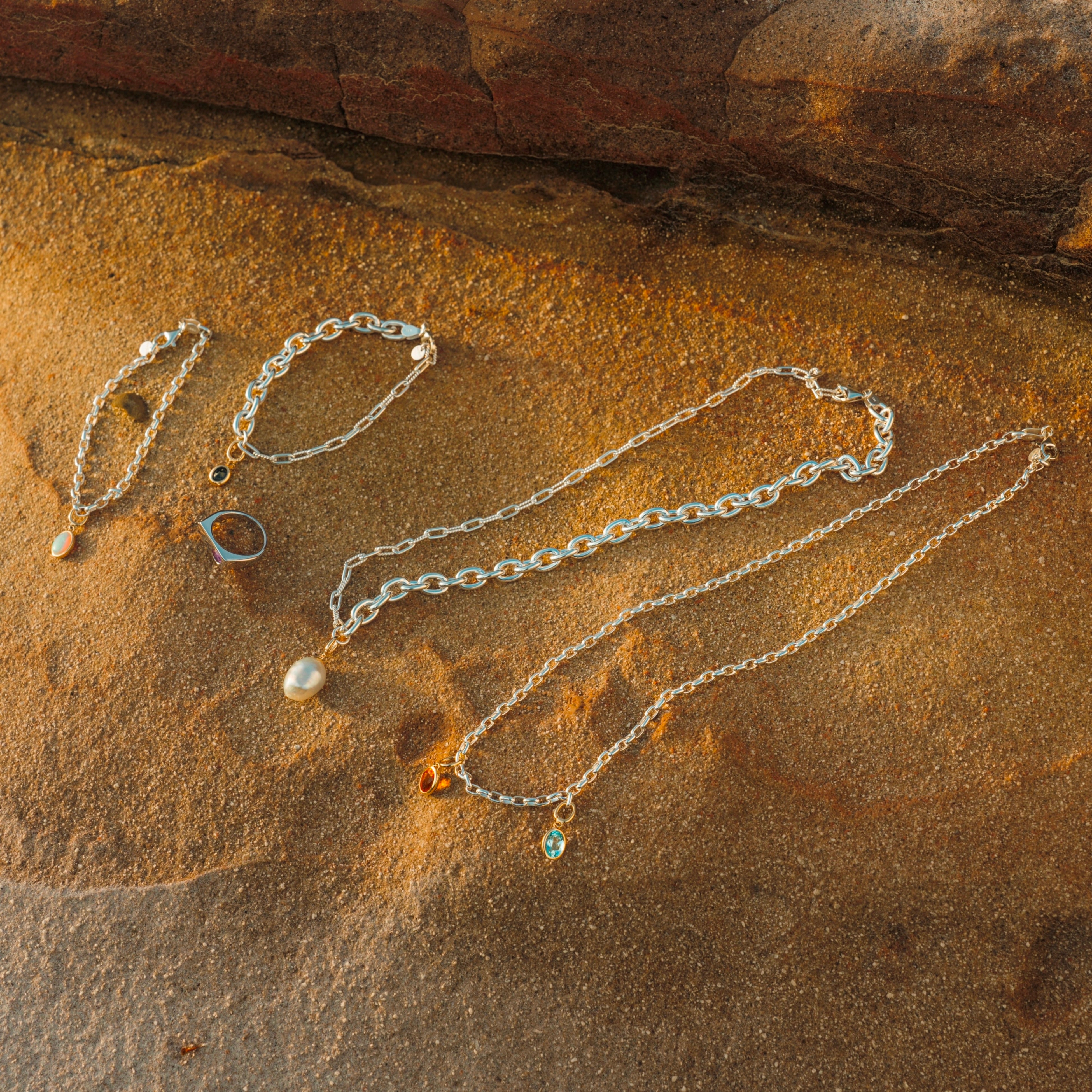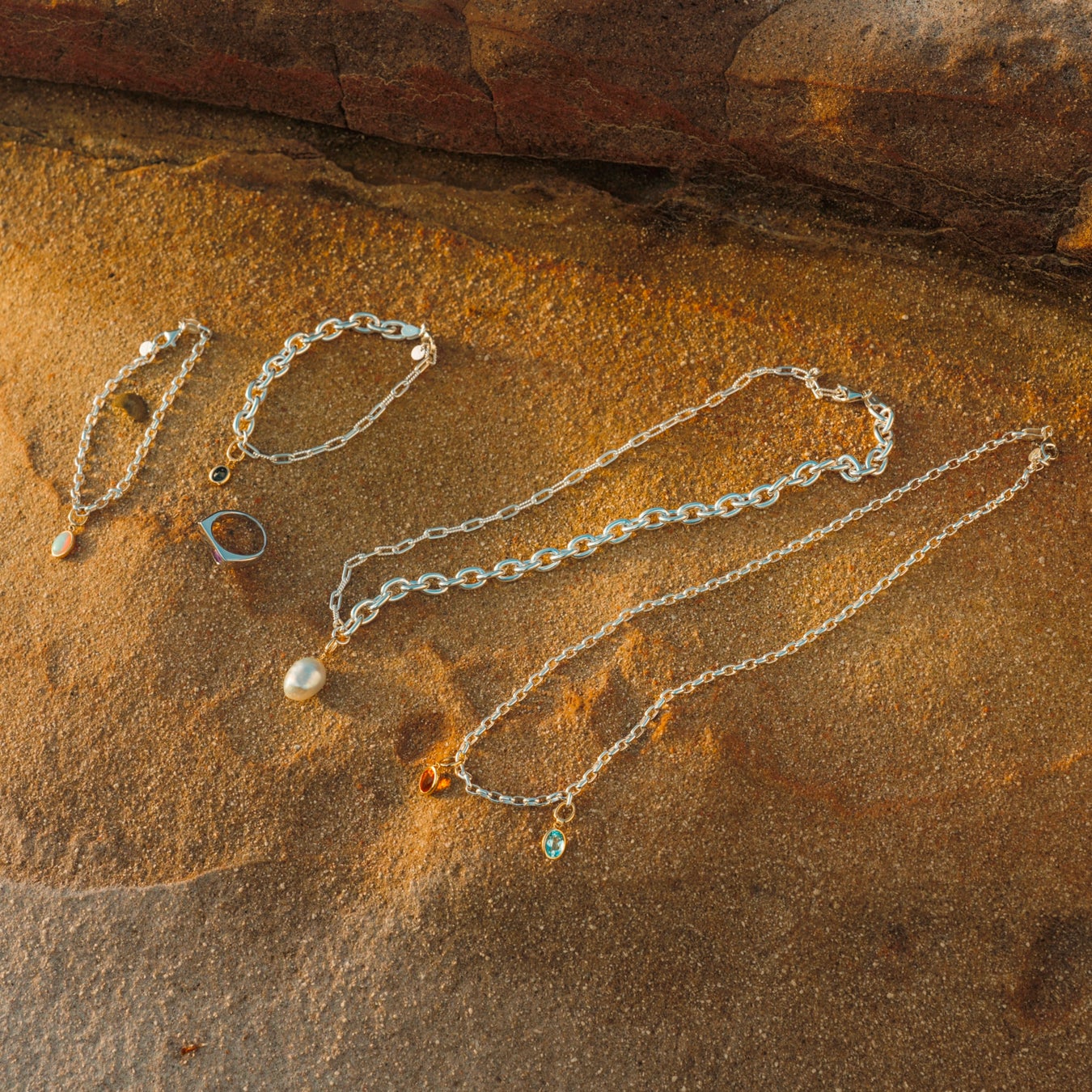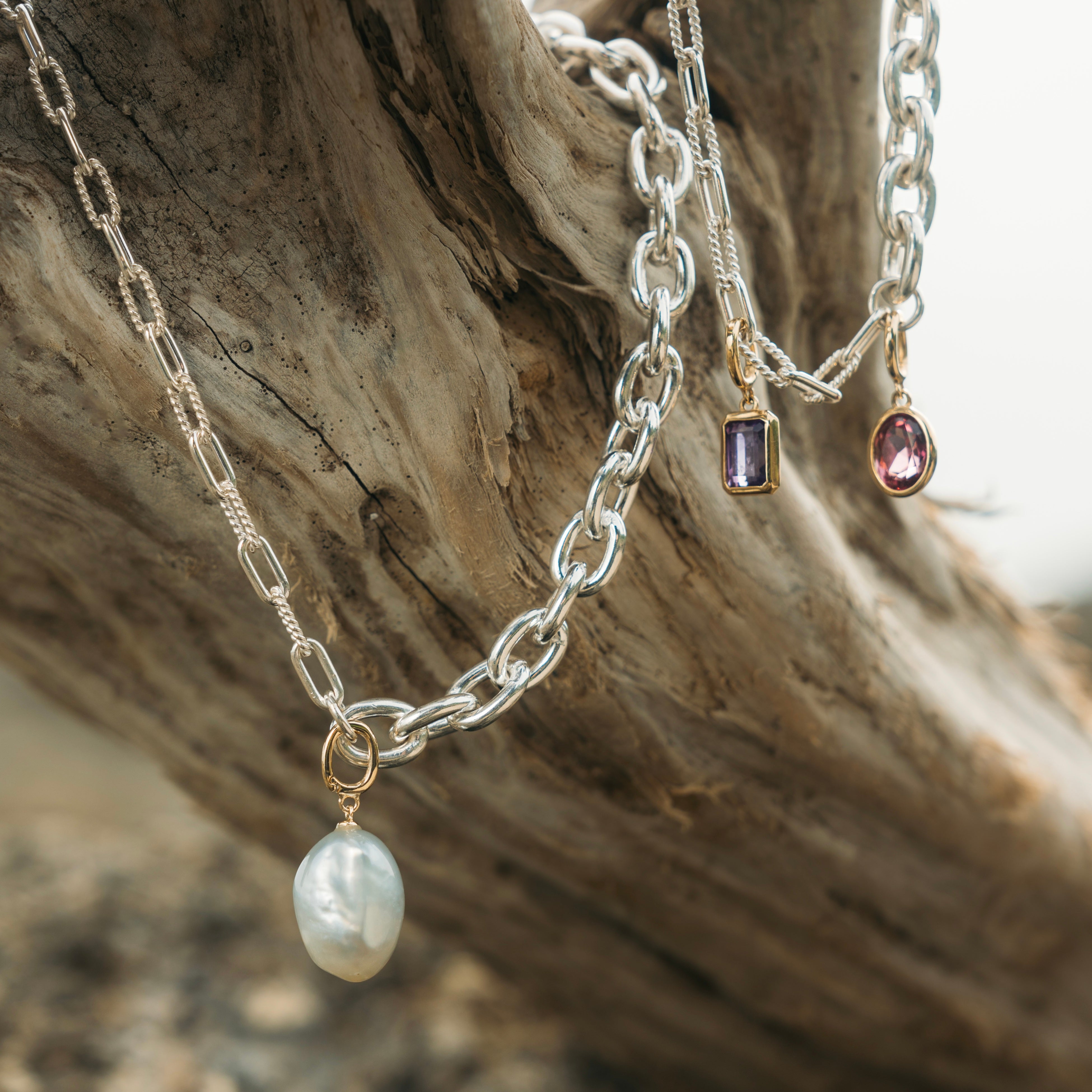 シンプルでありながらも毎日のスタイルにアクセントを加えてくれるデザインのシルバーのブレスレットやネックレス。天然石やパールなどののチャームをつけて自分だけのスタイリングを楽しむこともできます。