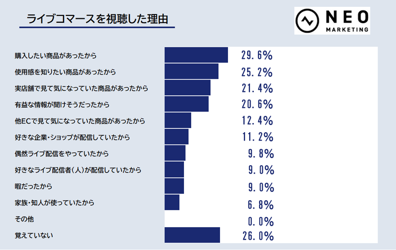「購入したい商品があったから」という理由で約30%を占め、そこに「使用感を知りたい商品があったから」が25.2%で続いています。一方、「好きなライブ配信者(人)が配信していたから」という理由は9.0%にとどまりました。