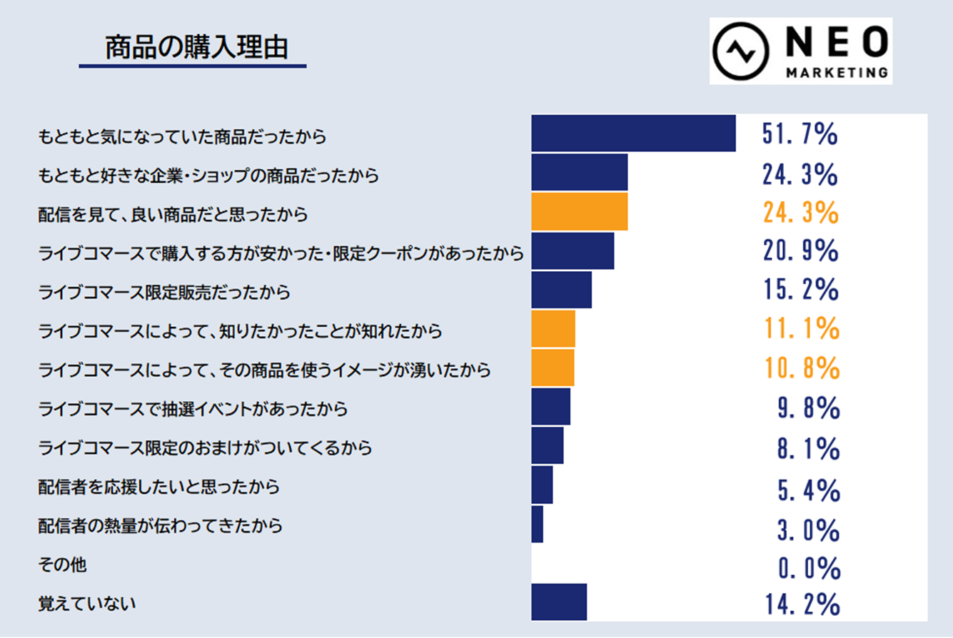 「もともと気になっていた商品だったから」という理由が51.7%を占める一方で、「配信を見て、良い商品だと思ったから」と回答した割合が24.3%、そして「ライブコマースによって、知りたかったことが知れたから」「ライブコマースによって、その商品を使うイメージが湧いたから」と回答した割合も、それぞれ約11%前後を獲得しています。