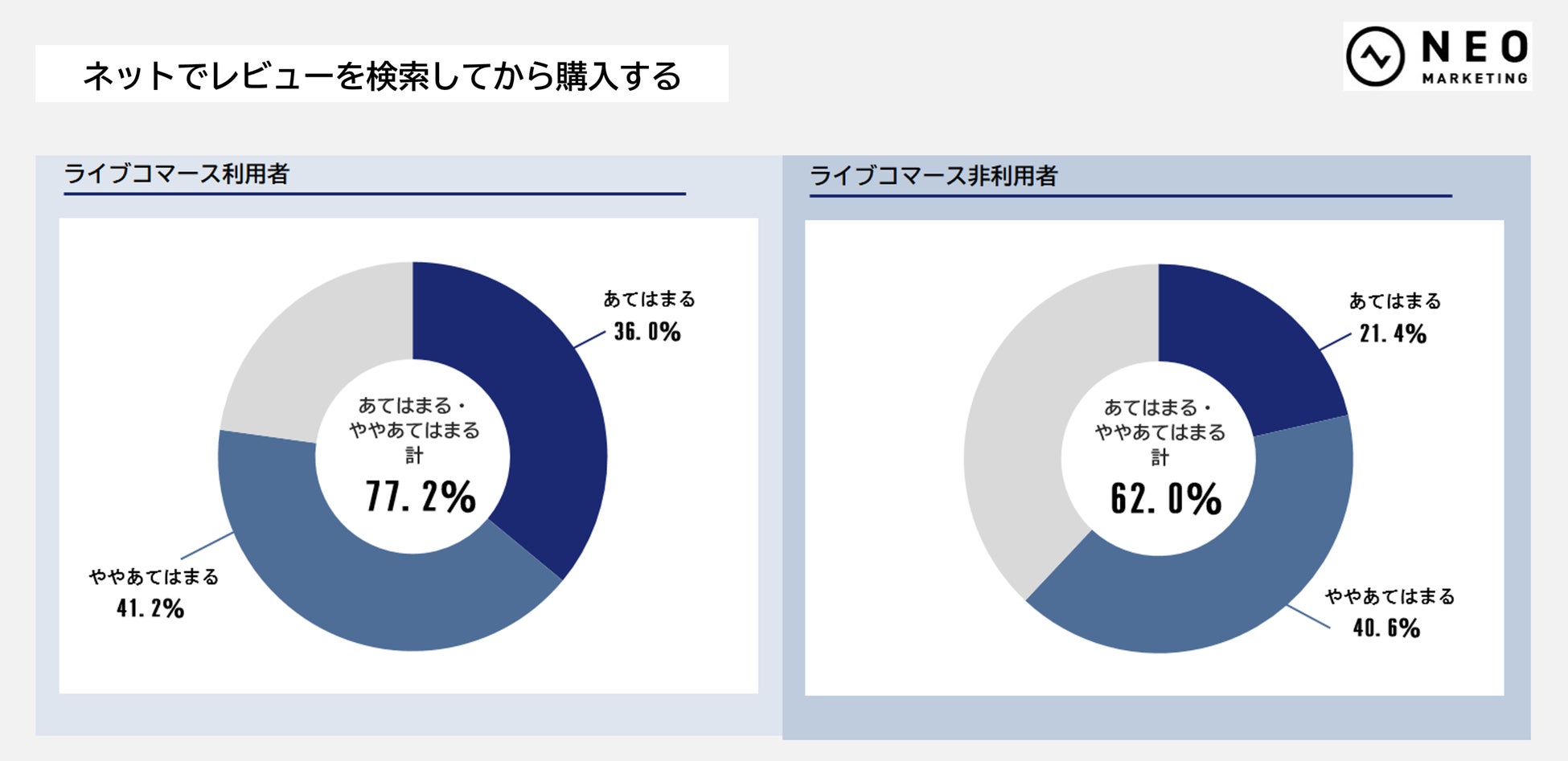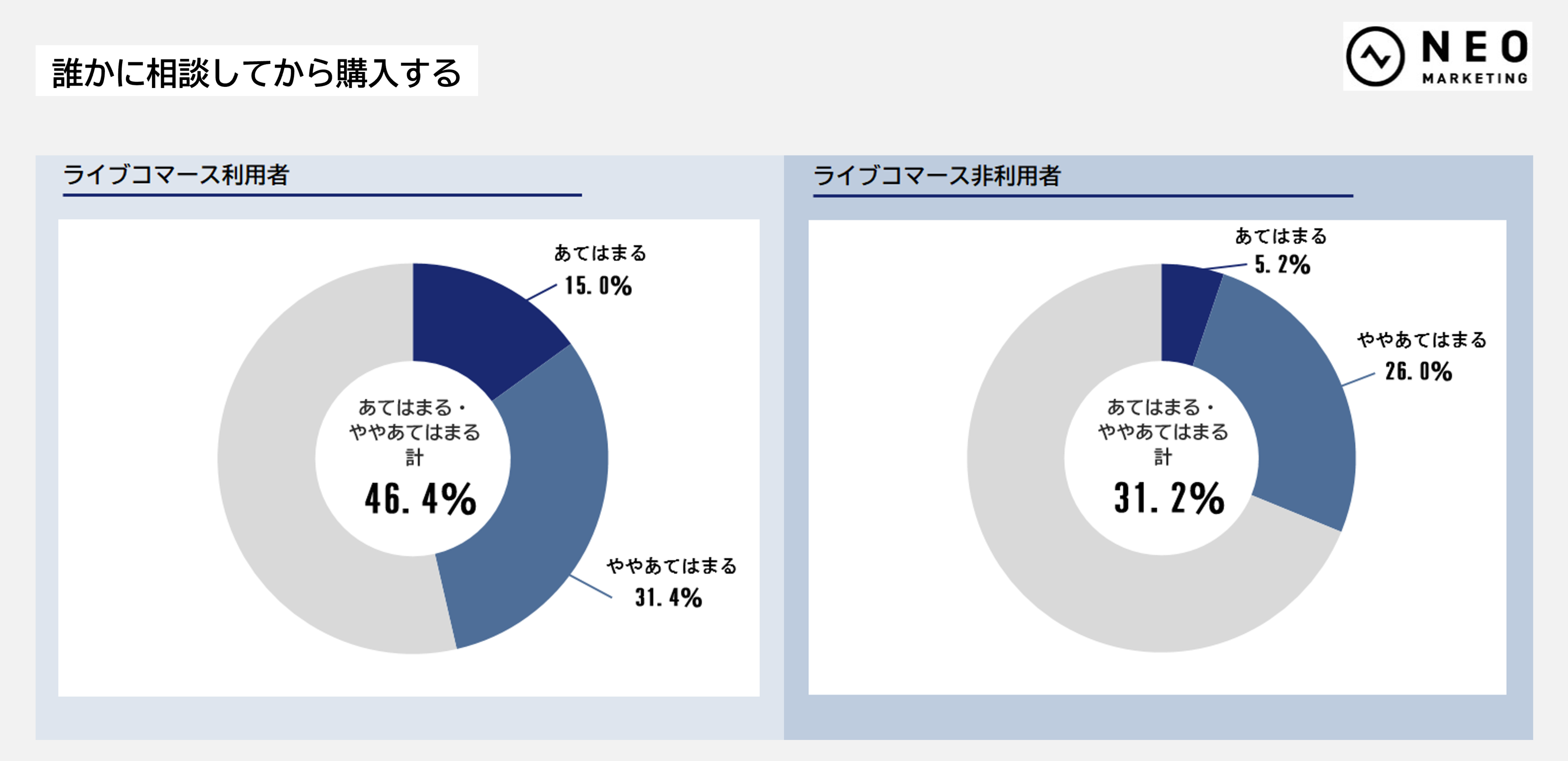 「ネットでレビューを検索してから購入」「誰かに相談してから購入」といった購入前の情報収集の割合についても、ライブコマース利用者は非利用者より約15ポイント高くなった。普段からライブコマース利用者は商品購入前の検討段階において、商品をよく知るために積極的な行動をとる傾向にあることが分かる。