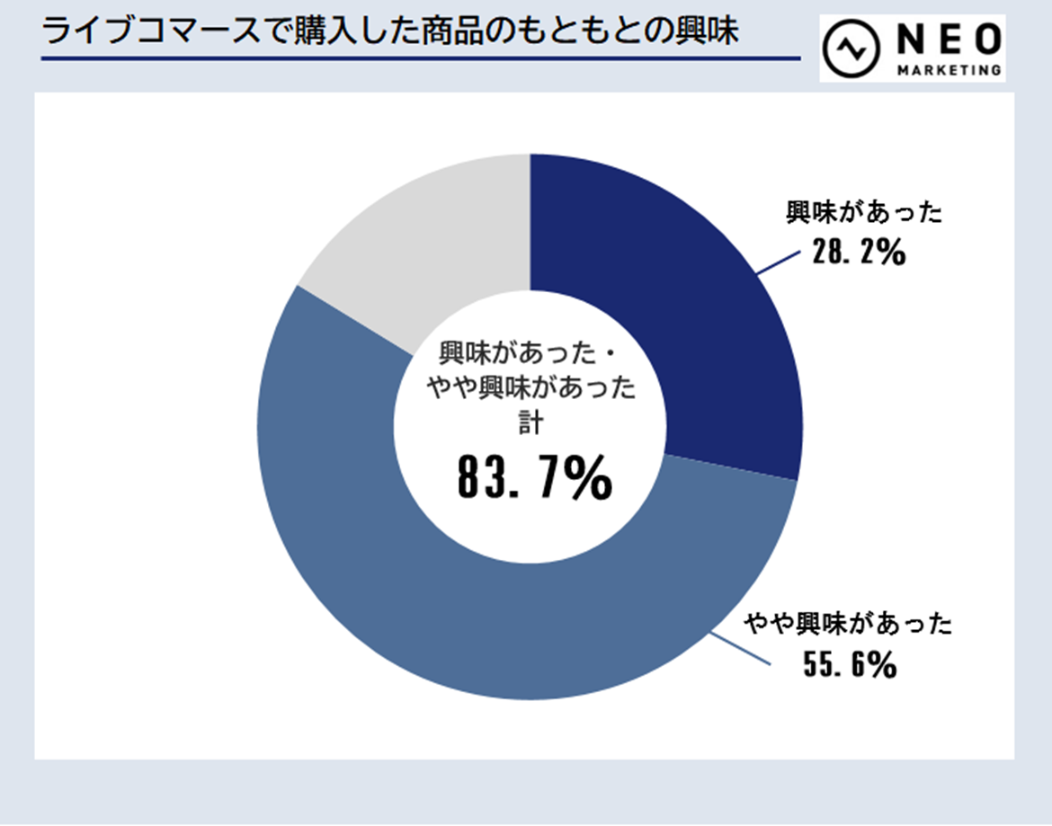ライブコマースにて商品を購入する方の大半が、少なくともやや興味がある状態でライブコマースに参加していることが分かります。