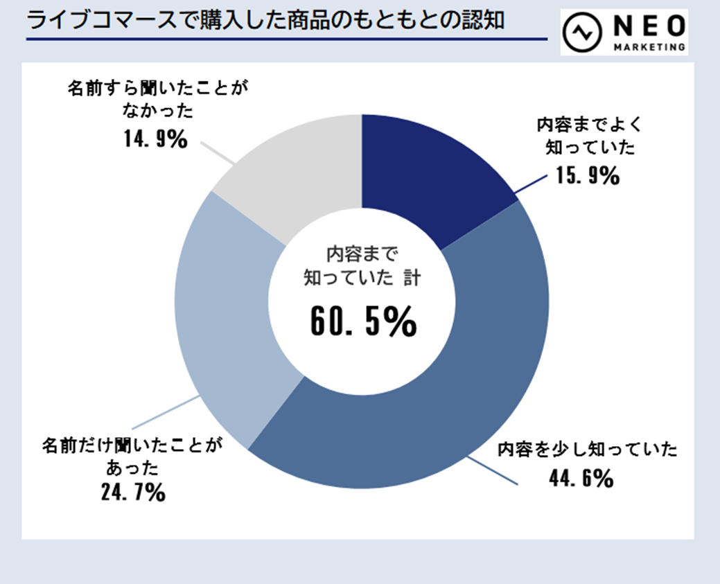 商品の内容を既に認知していた割合は60.5%となりました。そのうち15.9%の方は「内容までよく知っていた」状態でライブコマースを視聴し、購入したということが分かりました。