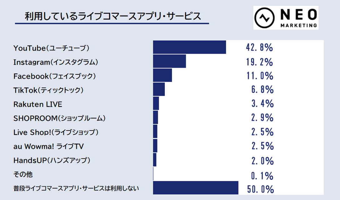 ライブコマースアプリ・サービスとして、42.8%は「YouTube(ユーチューブ)」を利用していることが分かりました。「Instagram(インスタグラム)」の19.2%と大差をつけています。