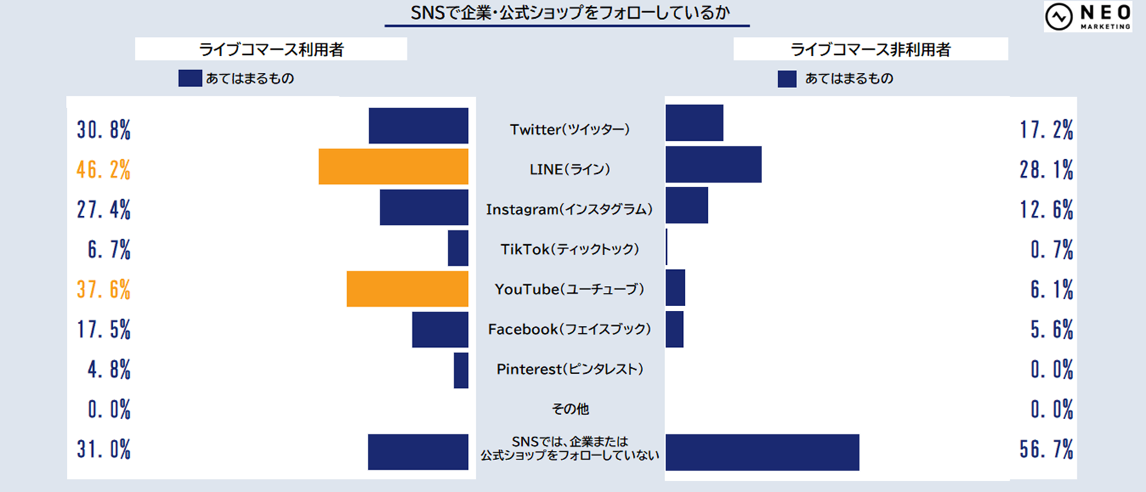 どのSNSについても、ライブコマース利用者は非利用者よりも、企業または公式ショップアカウントをフォローしている割合が高いことが分かります。