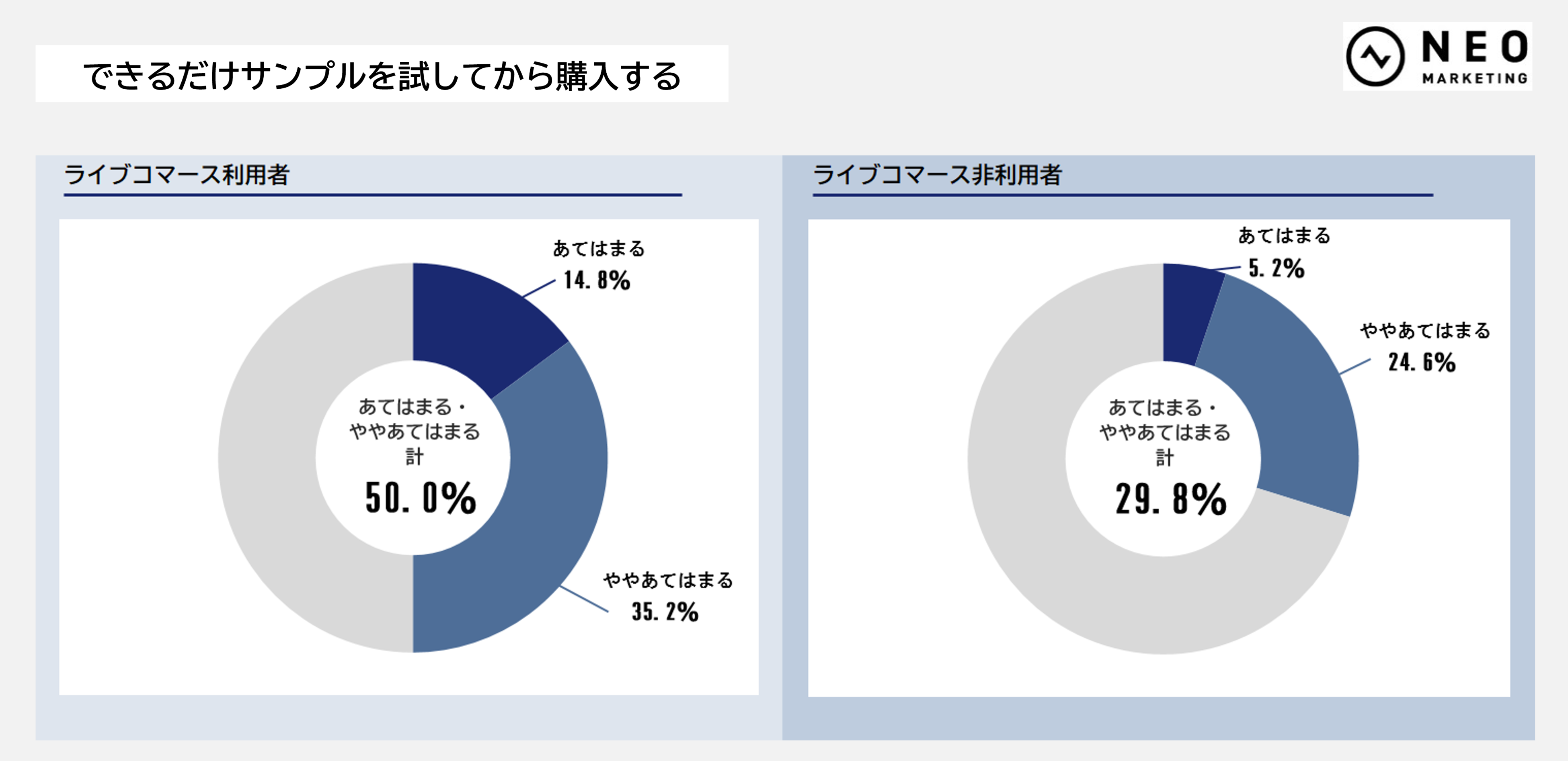 ◆普段の購買行動は:「できるだけサンプルを試してから購入」ライブコマース利用者は50.0%・非利用者は29.8%