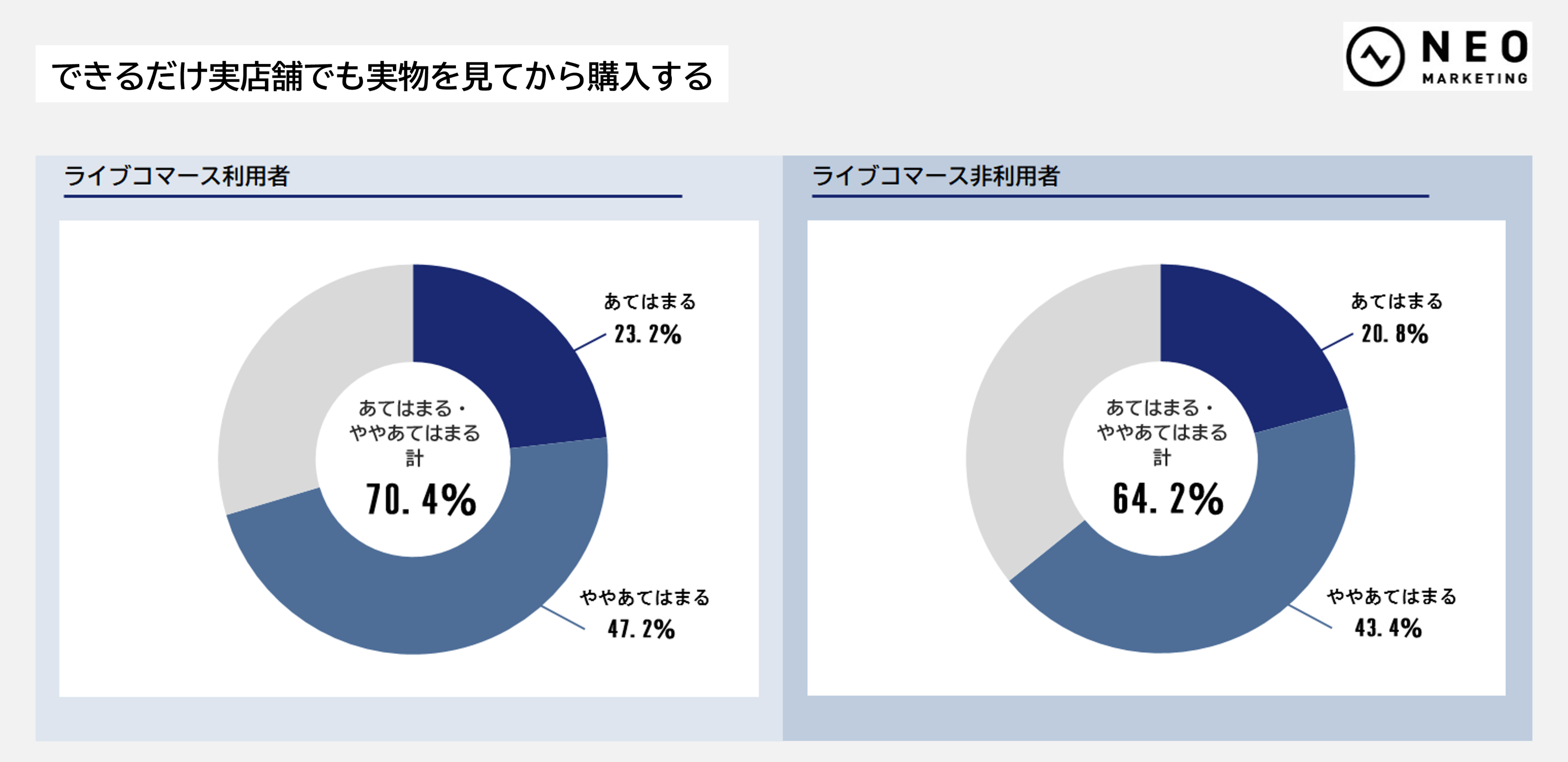 「ネットでレビューを検索してから購入する」「誰かに相談してから購入する」等といった、購入前の情報収集をする割合は、ライブコマース利用者が非利用者よりも約15ポイント高くなりました。また、「できるだけサンプルを試してから購入する」割合はライブコマース利用者は50.0%・非利用者は29.8%と、約20ポイントの差がありました。