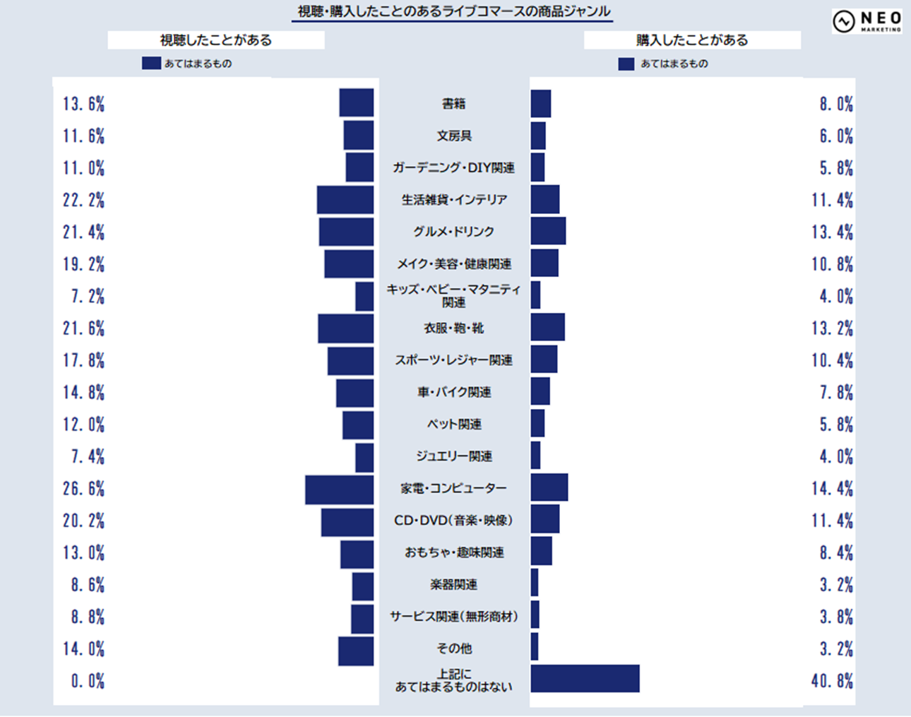 「家電・コンピューター」が、視聴したことがあるライブコマースで26.6%・購入したことがあるライブコマースとして14.4%と、最も高い割合を獲得しました。