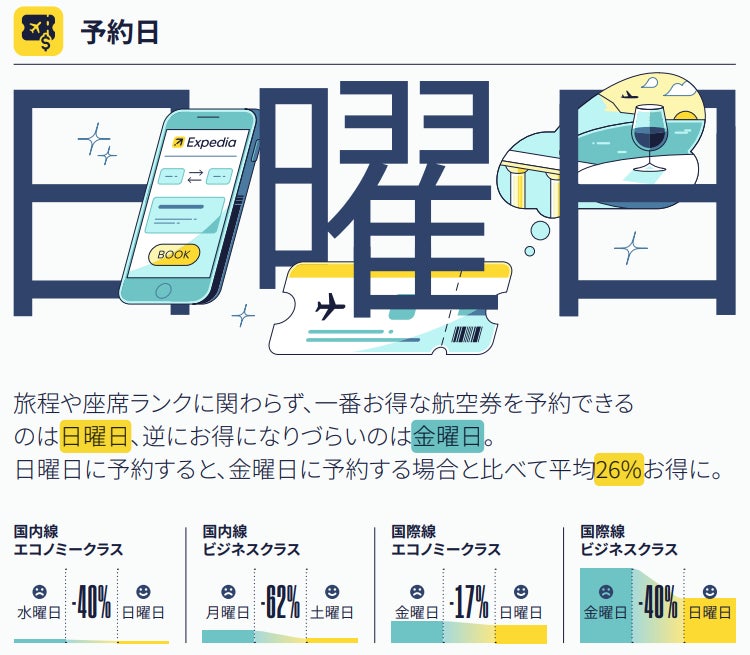 また、国内線のエコノミークラスの場合、日曜日に予約すると平均で約40%、国際線のエコノミークラスの場合は日曜日の予約で平均約17%お得になります。