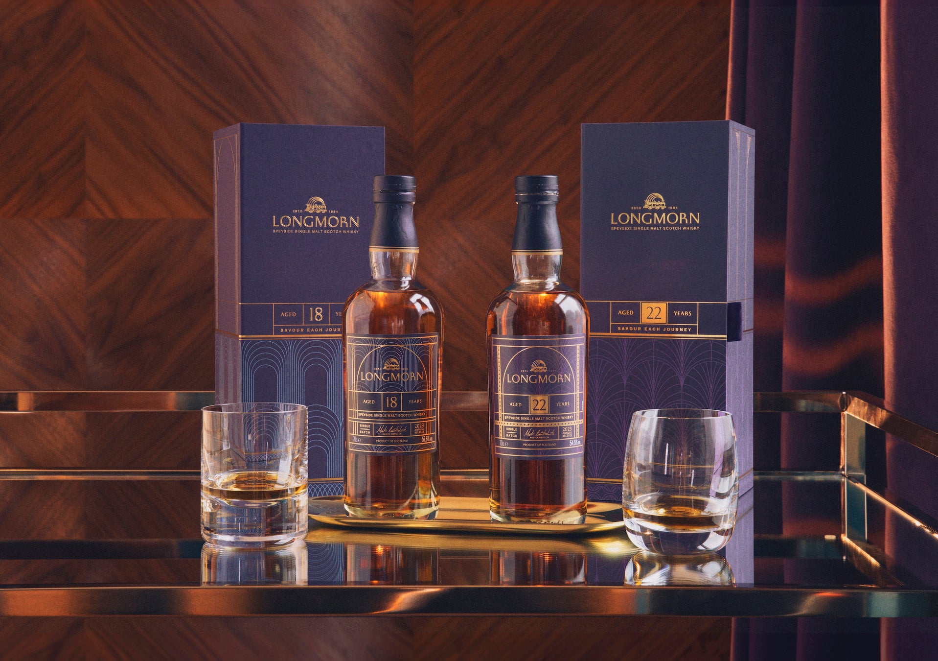 独立ブランドとして新登場する『ロングモーン』は、全てのポートフォリオにおいて、厳選したアメリカンオーク樽で18年以上長期熟成された希少価値の高い製品のみをリリースします。年に一度のみボトリングするスモールバッチで毎年新しいバッチを発売するため、コレクション価値が非常に高いウイスキーです。製法にはカスクストレングス(加水をせず樽出しそのままのアルコール度数)と冷却濾過をしないノン・チルフィルタード製法を採用し、極めてピュアなスタイルのウイスキーに仕上げています。また、新パッケージは創業当時20世紀初頭のアールデコ様式にインスパイアされ、創業者によって建設された鉄道をモチーフにした新たなロゴと共に、ラグジュアリーな鉄道旅行を連想させるデザインです。