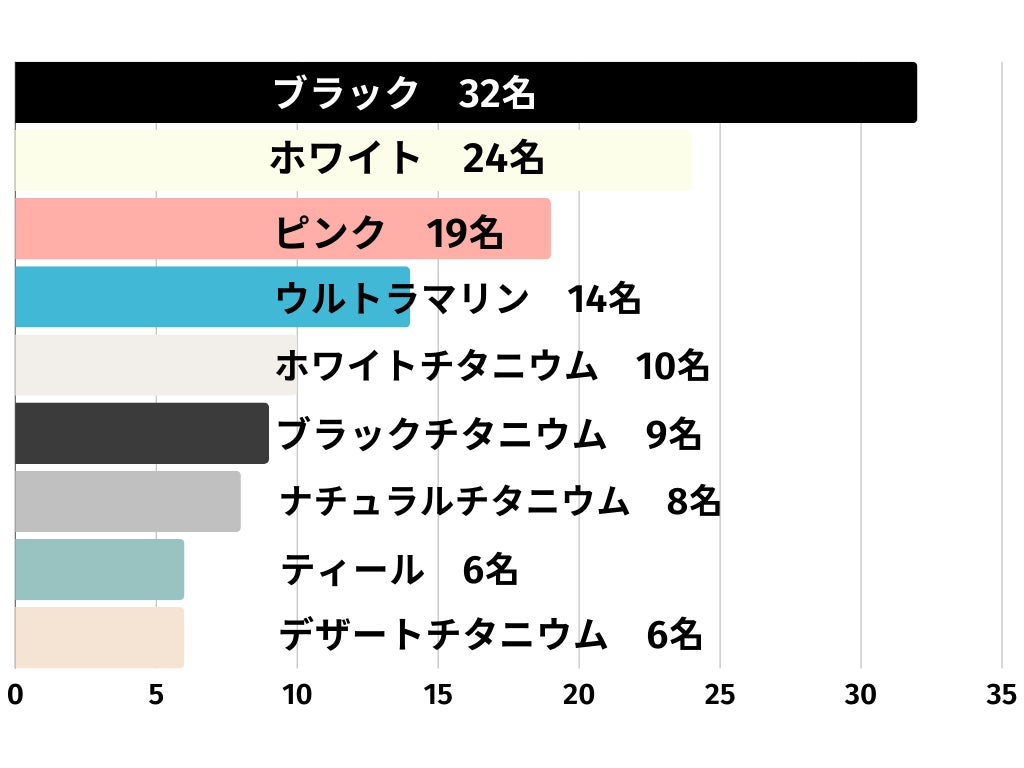 カラーは「ブラック」が最多で32名、続いて「ホワイト」が24名、「ピンク」が19名となっており、ベーシックなカラーに人気が集中しました。また、「ピンク」と回答した方のうち約84%の方は女性で、男女比に最も偏りがありました。