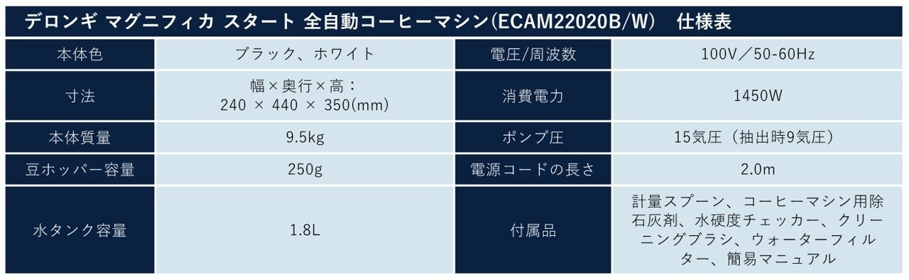 デロンギ・ジャパン株式会社(本社:東京都港区 代表取締役社長:杉本敦男)は、全自動コーヒーマシンのエントリーモデル『デロンギ マグニフィカ スタート 全自動コーヒーマシン(ECAM22020B/ECAM22020W)、以下マグニフィカ スタート)』を11月15日(水)より発売いたします。