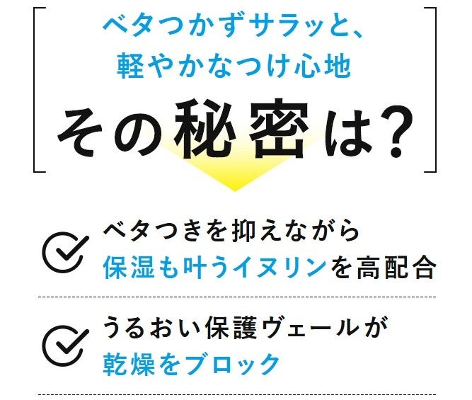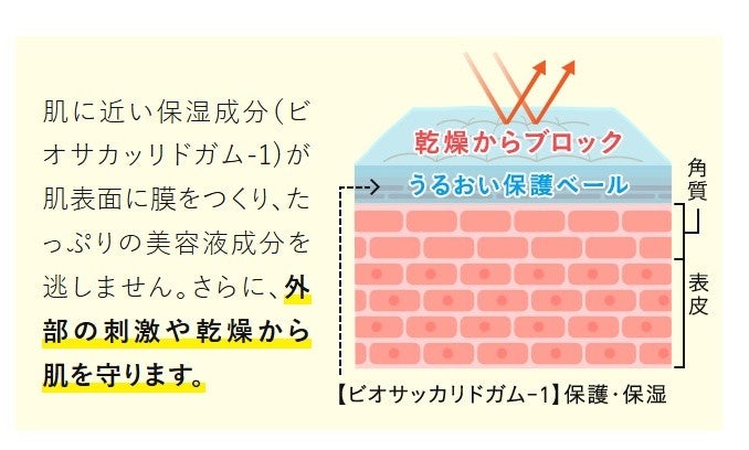 ベタつかずにサラッと軽やかなつけ心地は、イヌリンを高配合することで実現し、るおい保護ヴェールが乾燥をブロックします。肌に近い保湿成分(ビオサカッリドガム-1)が肌表面に膜を作り、たっぷりの美容液成分を逃しません。