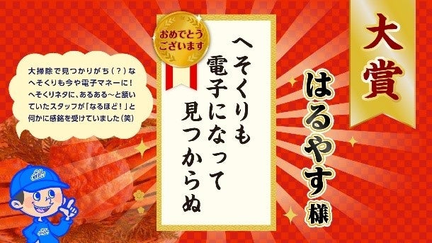 大賞には、大掃除に見つかりがちな「へそくり」と電子マネーの今風な組み合わせの一句「へそくりも 電子になって 見つからぬ」が選ばれました。