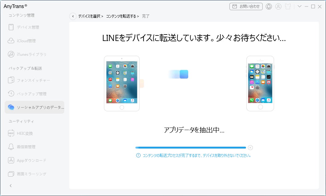 ステップ1、iPadをパソコンと接続し、ホーム画面左側のメニューに「ソーシャルアプリのデータ移行」をクリックし、lineを選び、「今すぐ転送」をクリックします。