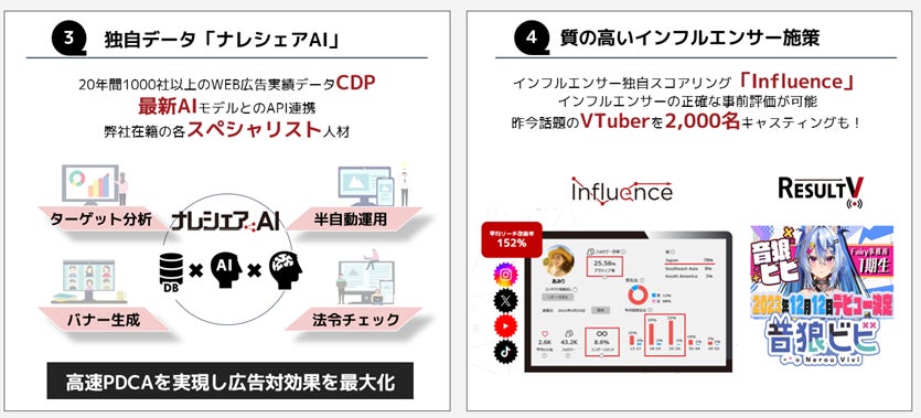幅広い媒体運用で蓄積した実データ、月3万本規模の制作ラインと品質管理、独自データ基盤「ナレシェアAI」とCDPの連携、2,000名超のインフルエンサーネットワーク。